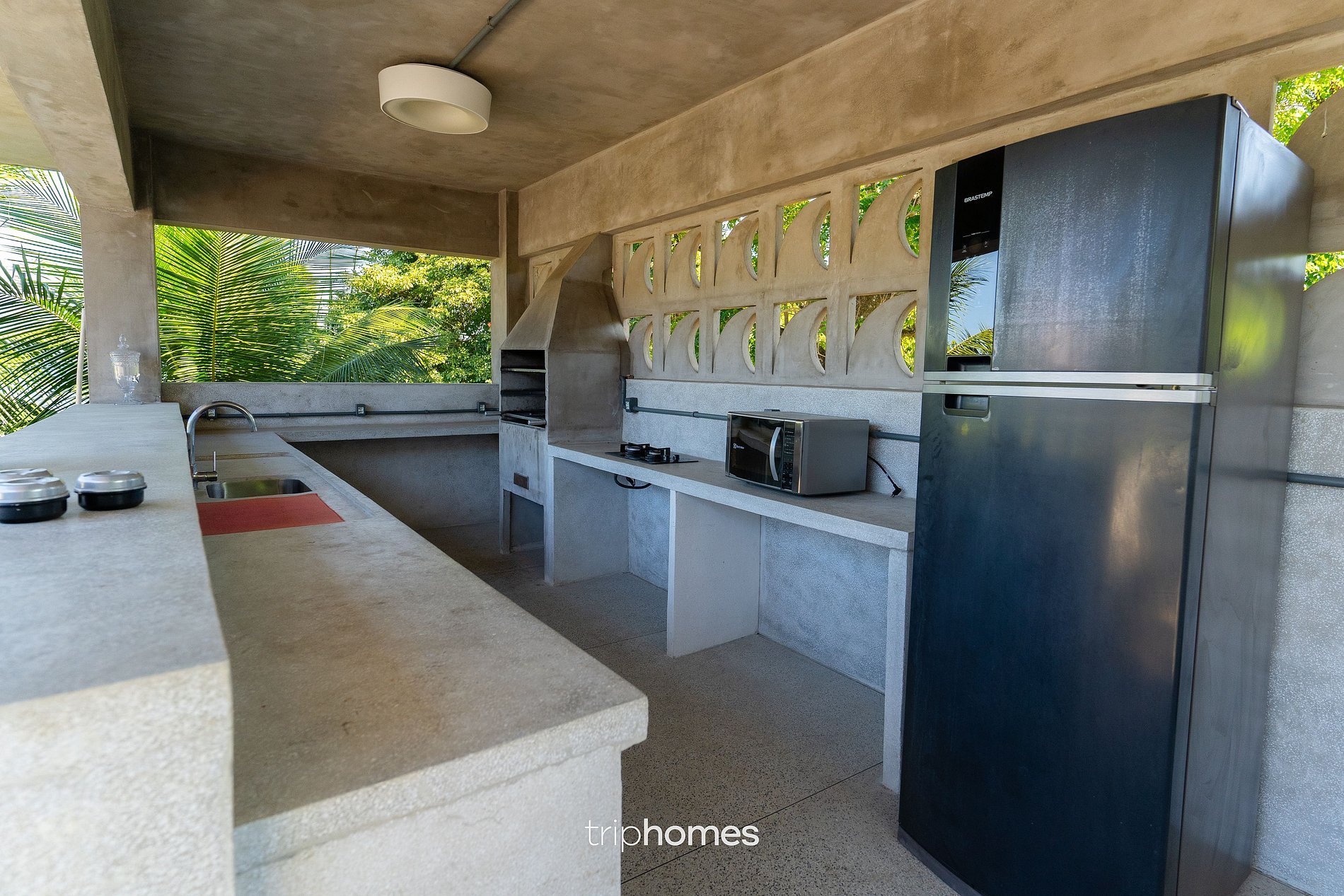 Cozinha completa com duas geladeiras, 1 freezer e 2 fornos elétricos
