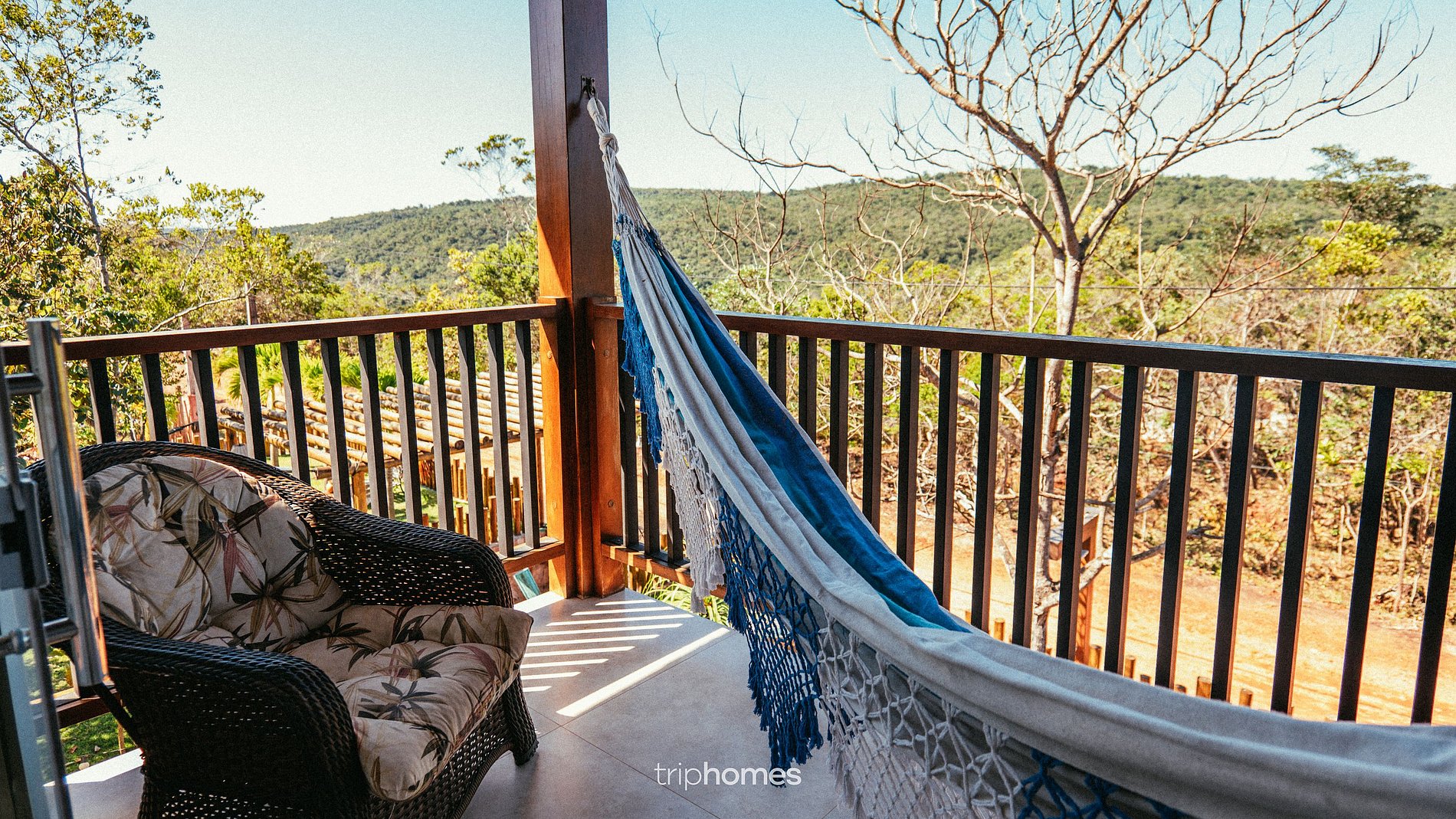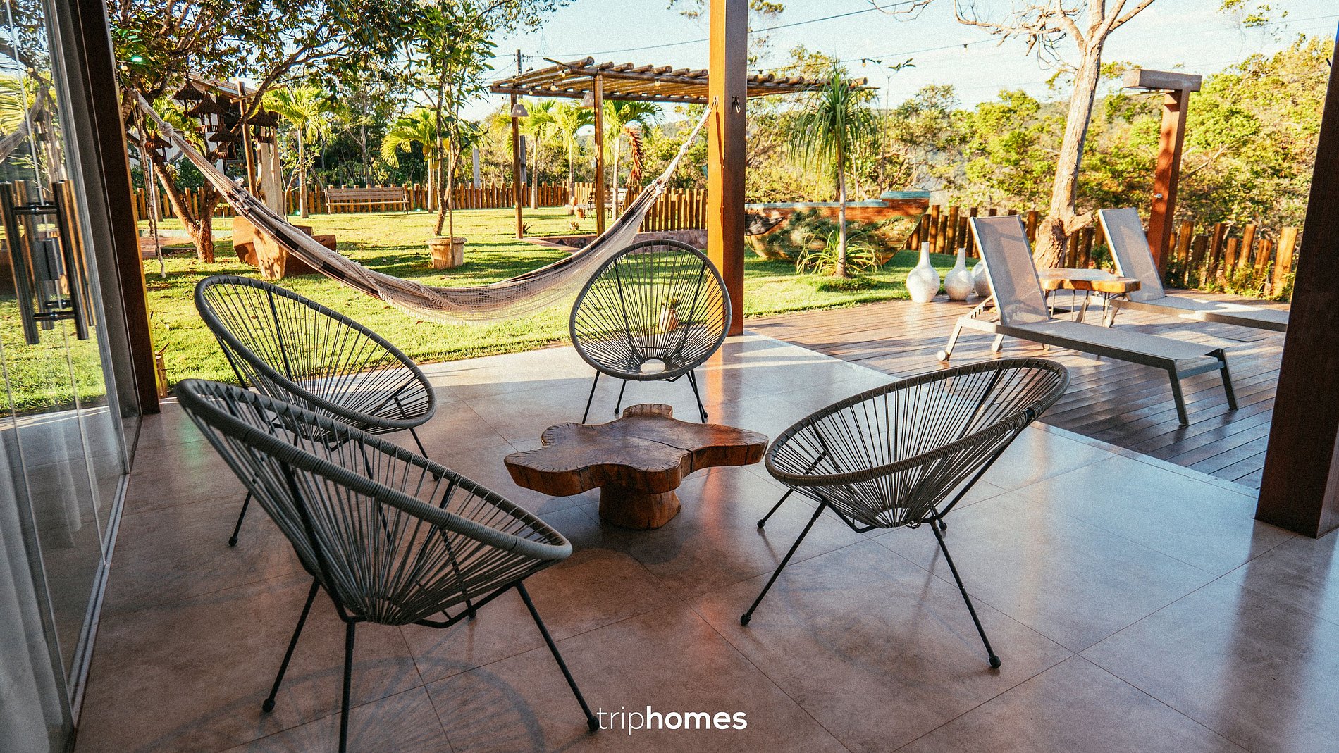Varanda espaçosa com churrasqueira e redes para relaxar