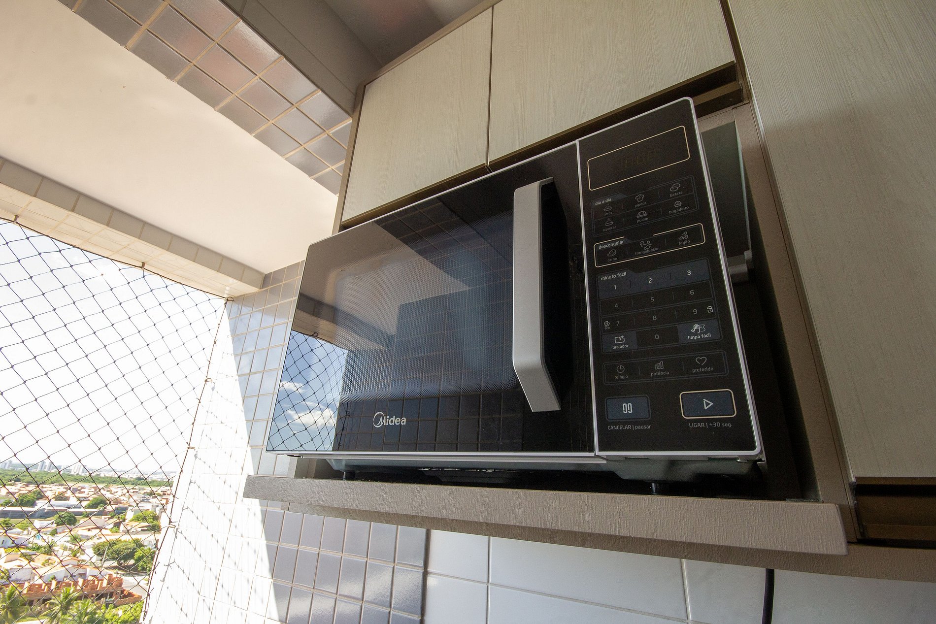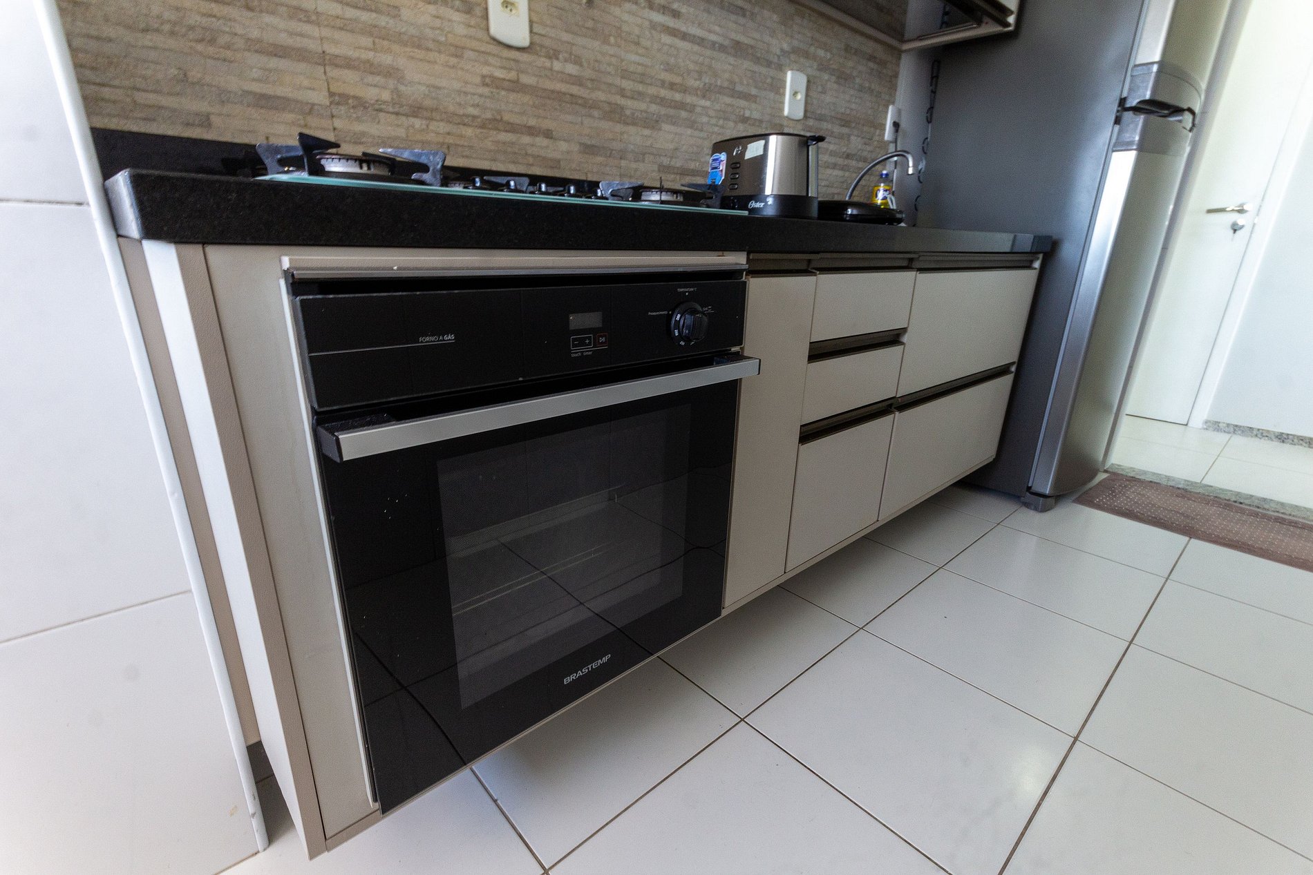 Cozinha completa com todos eletrodomésticos (geladeira, micro-ondas, torradeira e fogão) para preparar refeições.