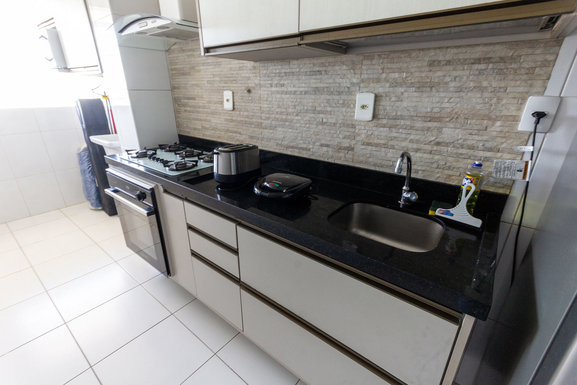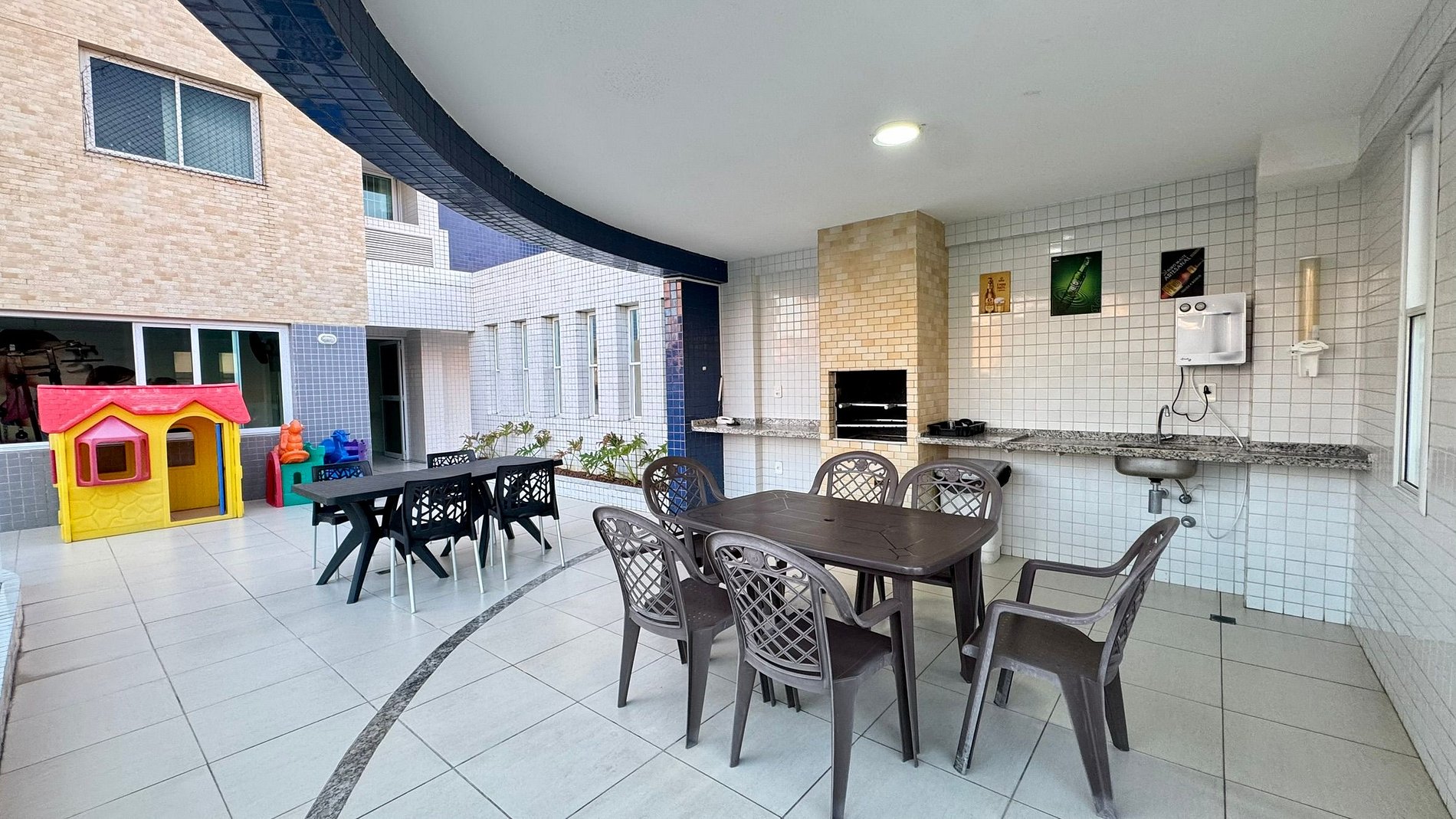 Condomínio com área de lazer completa: piscina moderna, salão de festas com churrasqueira, academia para musculação.