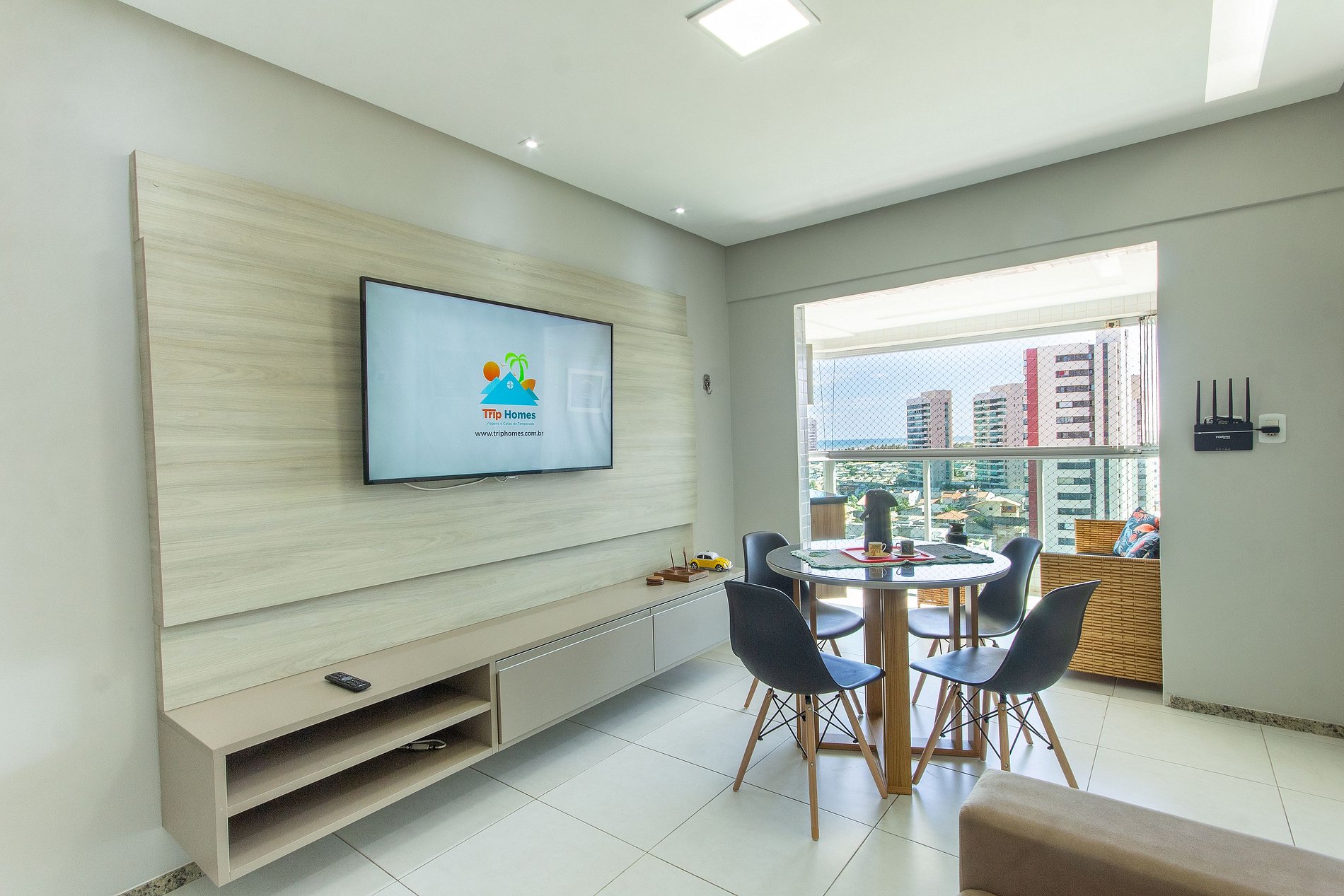 Sala de Estar com ar condicionado central, vista panorâmica para a Praia, TV Smart com multicanais, Internet Fibra Ótica super veloz (perfeito para quem trabalha de home-office), sofá de 2 lugares, mesa de jantar com 4 cadeiras.