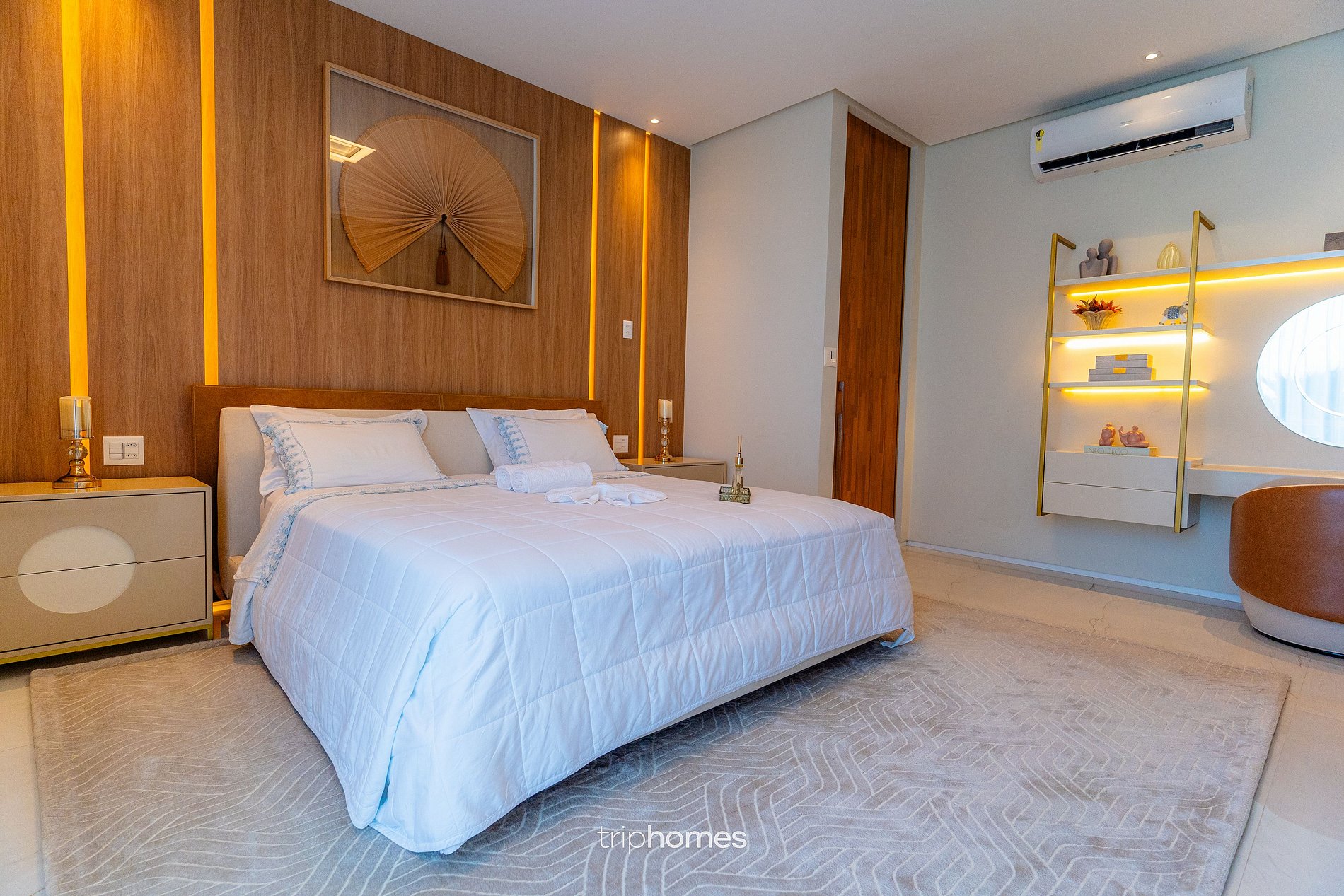 Os 6 quartos, sendo 5 suítes, todos decorados com elegância, modernidade e conforto, com lençóis e toalhas Prime.