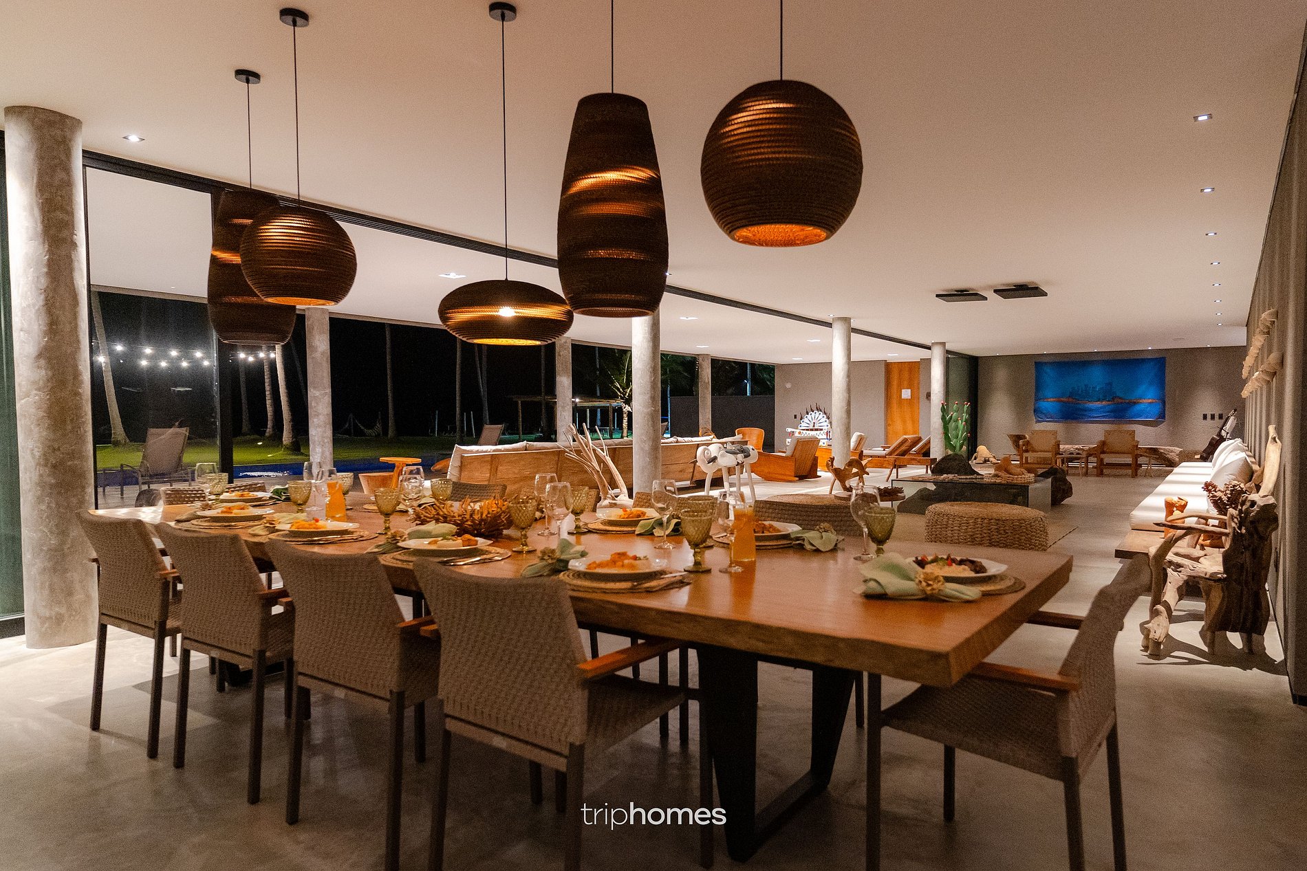 Com 10 suítes elegantemente projetadas ao estilo rústico chic e arquitetura assinada pelo arquiteto Rodrigo Fagá, a Mansão Premium Beira-Mar oferece acomodações espaçosamente elegantes para até 24 pessoas, garantindo privacidade e conforto.