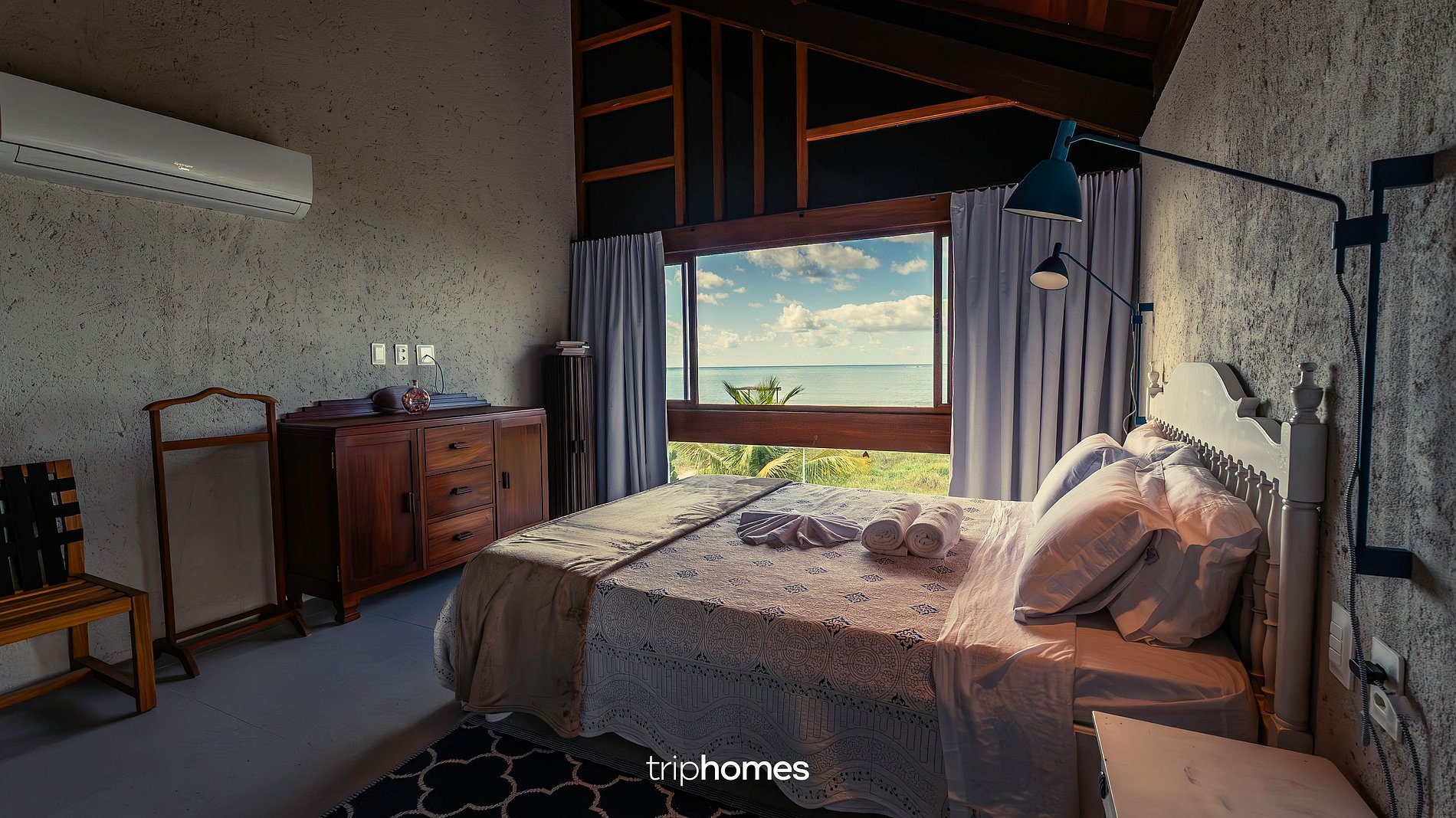 Na ala íntima, três suítes térreas oferecem camas queen e de solteiro, armários com cabideiros, banheiros privativos e climatização, sendo ideais para famílias ou grupos que preferem acesso direto ao térreo. Já no andar superior, a suíte master é um verdadeiro destaque: espaçosa e elegante, com cama king size, guarda-roupa amplo, estante de livros, poltronas e decoração autoral. O banheiro, diferenciado, conta com dois vasos sanitários e dois espelhos, e a varanda privativa com vista frontal para o mar reúne sofá e mesa de centro, proporcionando um cenário perfeito para apreciar a brisa e a paisagem.