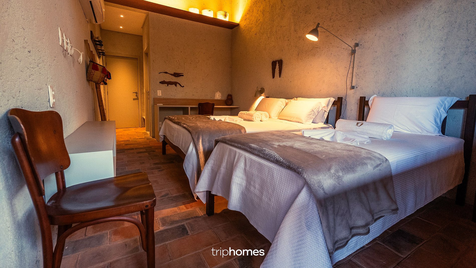 Com uma proposta visual artística, a propriedade traz em todos os ambientes — internos e externos — peças decorativas exclusivas, criadas especialmente para o espaço. A ambientação une elementos rústicos e contemporâneos em um projeto que valoriza o bem-estar, a estética e o contato direto com a natureza.