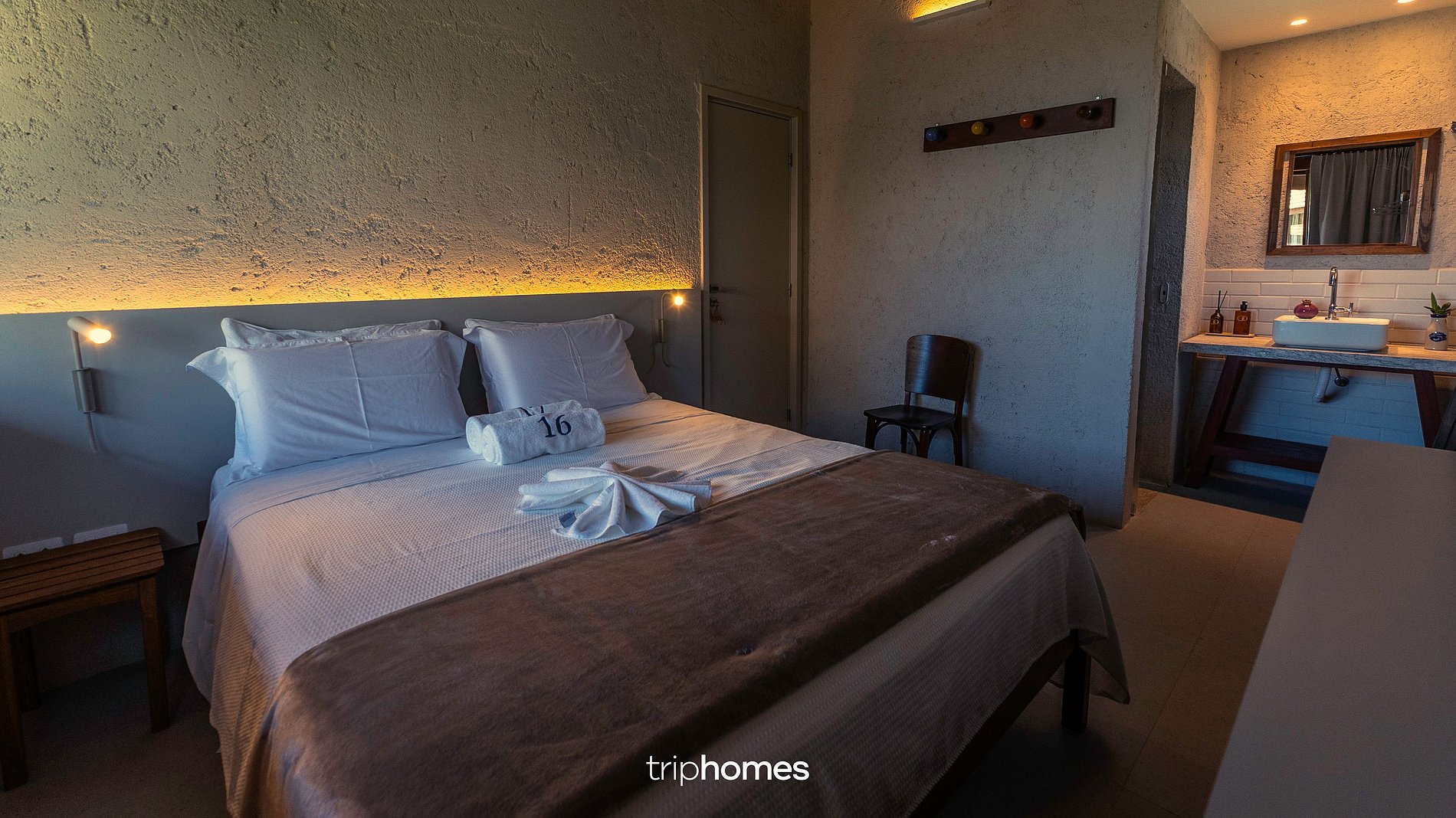 Na ala íntima, três suítes térreas oferecem camas queen e de solteiro, armários com cabideiros, banheiros privativos e climatização, sendo ideais para famílias ou grupos que preferem acesso direto ao térreo. Já no andar superior, a suíte master é um verdadeiro destaque: espaçosa e elegante, com cama king size, guarda-roupa amplo, estante de livros, poltronas e decoração autoral. O banheiro, diferenciado, conta com dois vasos sanitários e dois espelhos, e a varanda privativa com vista frontal para o mar reúne sofá e mesa de centro, proporcionando um cenário perfeito para apreciar a brisa e a paisagem.