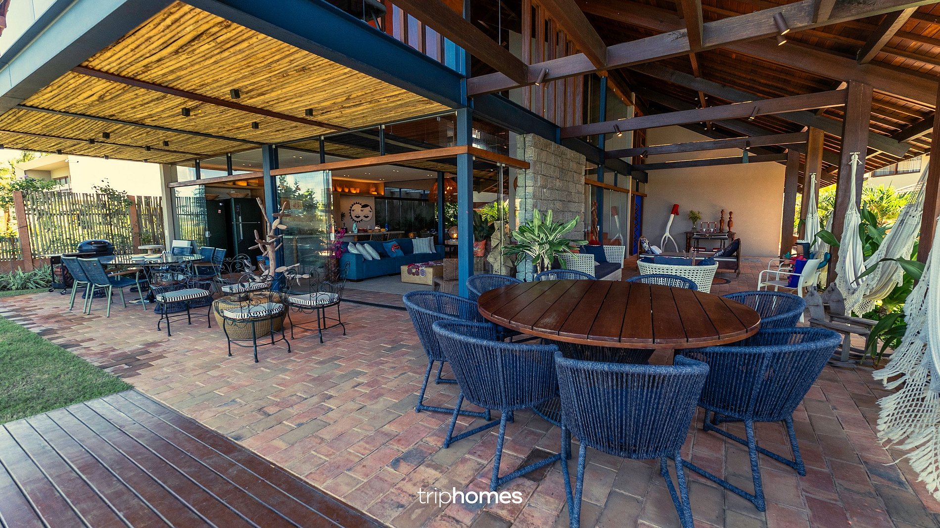 A casa principal, por sua vez, é o coração social da vila. Sua área externa gourmet se destaca pela piscina com cascata que percorre a lateral da casa, chegando ao centro do espaço emoldurada por uma hidromassagem, criando um visual surpreendente. Mobiliada com sofás, redes, cadeiras e mesas para grandes grupos, a área se transforma em um verdadeiro lounge tropical, ideal para confraternizações. Um guarda-sol grande, churrasqueira portátil e mesa de ping-pong completam o ambiente de lazer. A cozinha de apoio integrada dispõe de cooktop por indução, cervejeira, geladeira, máquina de gelo e uma ilha com banquetas altas em corda náutica, além de uma charmosa mesinha de café.