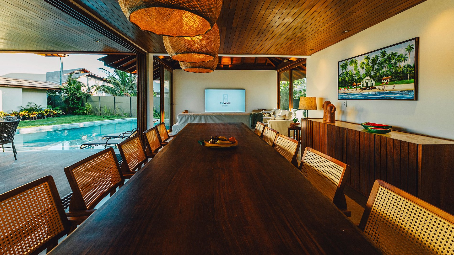 Cada casa do complexo oferece ambientes amplos e integrados, projetados para o bem-estar e a convivência. As áreas gourmet são convidativas, com mesas redondas cercadas por cadeiras de corda náutica e piscinas com formato orgânico que se conectam naturalmente à arquitetura do espaço. A ambientação externa é complementada por espreguiçadeiras, sofás e ombrelones que transformam cada área de lazer em um convite ao descanso. Internamente, as salas de estar contam com sofás generosos, poltronas confortáveis, decoração suave e televisões de última geração, criando um ambiente acolhedor para reunir todos em momentos de relaxamento. As salas de jantar, também amplas, se conectam às cozinhas completas, equipadas com eletrodomésticos modernos, como air fryer, freezer vertical, micro-ondas, bebedouro e fogão de cinco bocas.
