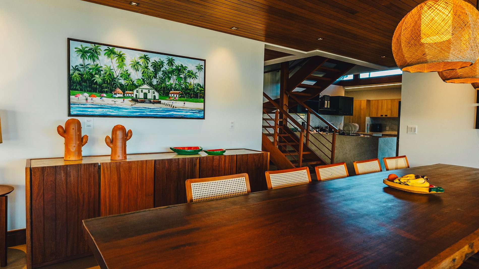 À frente das casas, o gazebo de frente para o mar é um espetáculo à parte. Com área coberta e descoberta, oferece uma cozinha de apoio equipada com ilha central, geladeira, cooktop, adega e forno, além de uma mesa oval para 10 pessoas e sofás em corda náutica que acolhem com charme e sofisticação. O deck de madeira, suspenso sobre a areia, permite que as refeições sejam feitas com o mar a poucos passos de distância — apenas 20 metros separam o gazebo da faixa de areia, tornando o cenário ainda mais exclusivo.
