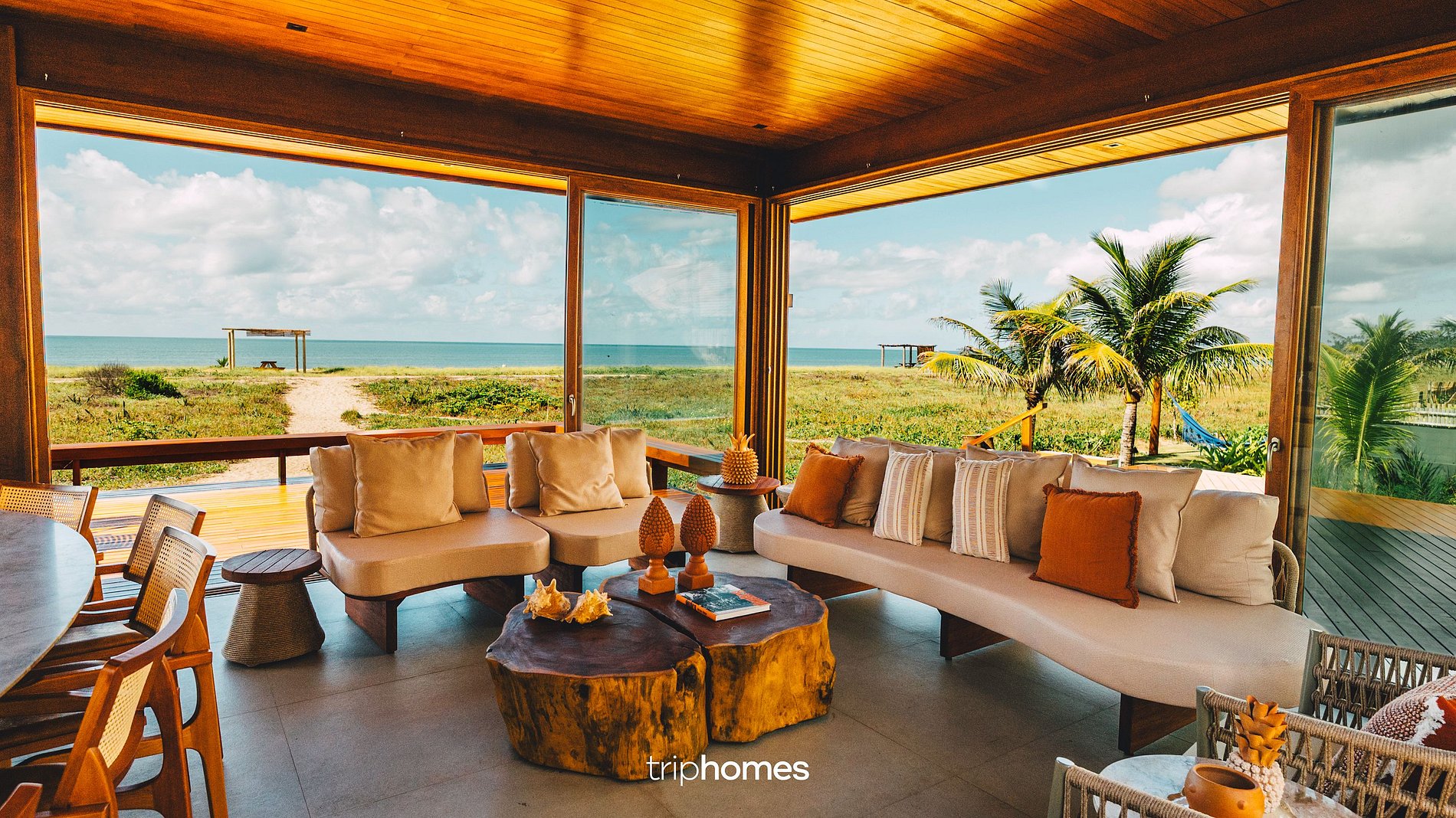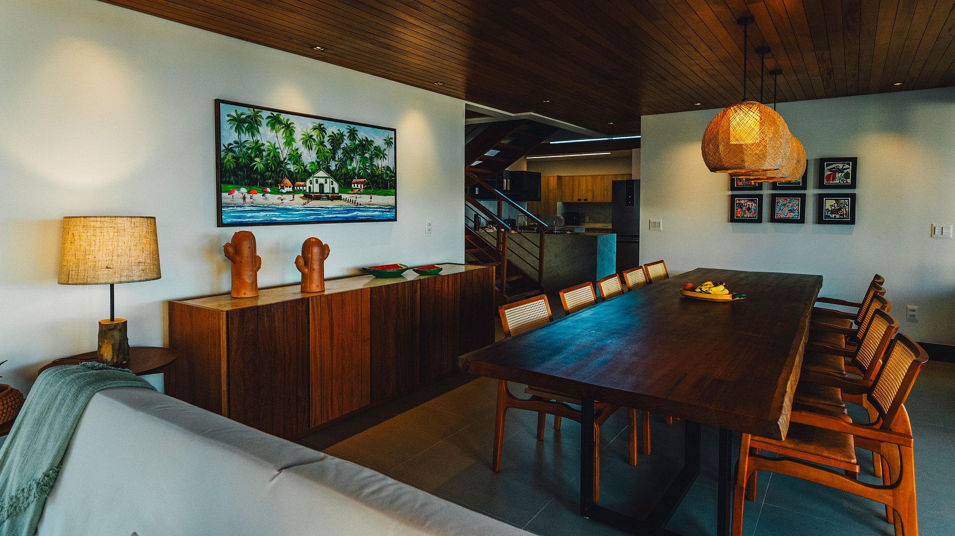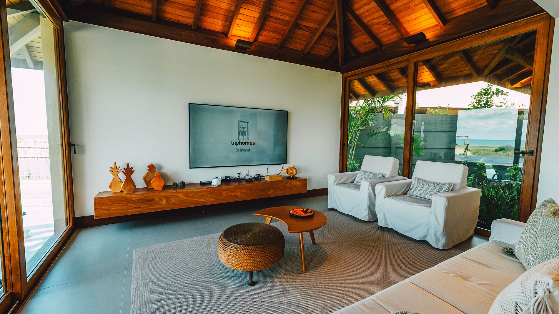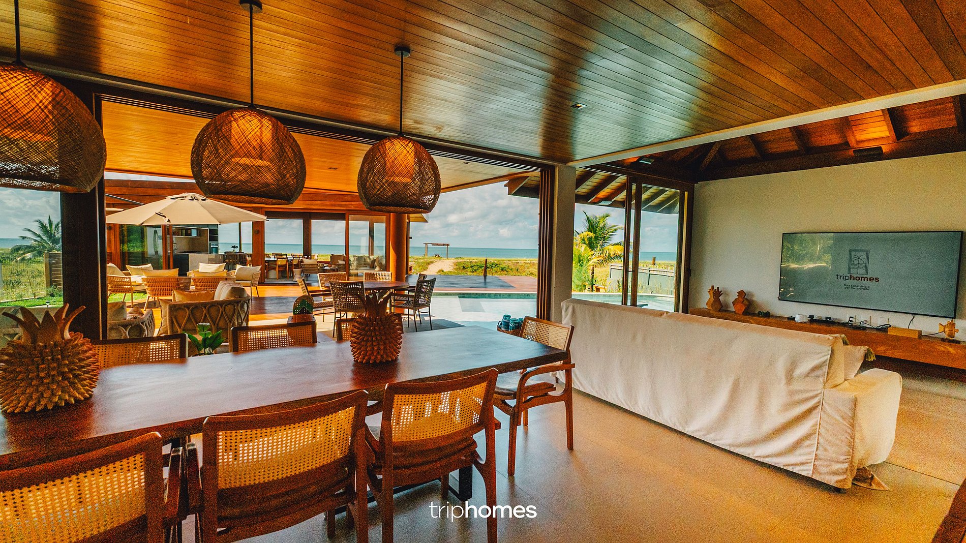 À frente das casas, o gazebo de frente para o mar é um espetáculo à parte. Com área coberta e descoberta, oferece uma cozinha de apoio equipada com ilha central, geladeira, cooktop, adega e forno, além de uma mesa oval para 10 pessoas e sofás em corda náutica que acolhem com charme e sofisticação. O deck de madeira, suspenso sobre a areia, permite que as refeições sejam feitas com o mar a poucos passos de distância — apenas 20 metros separam o gazebo da faixa de areia, tornando o cenário ainda mais exclusivo.