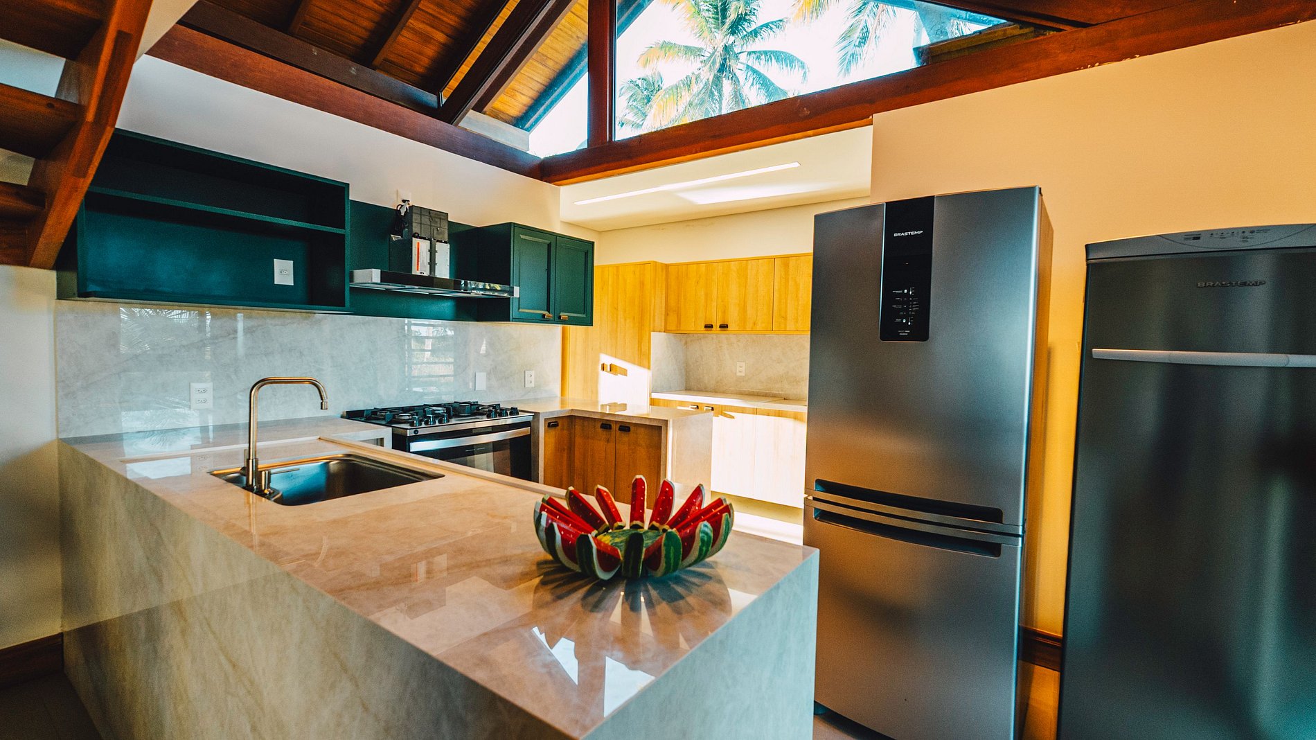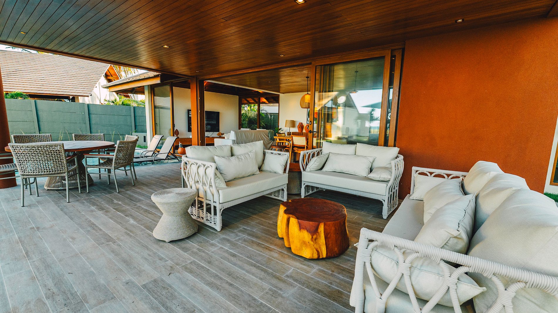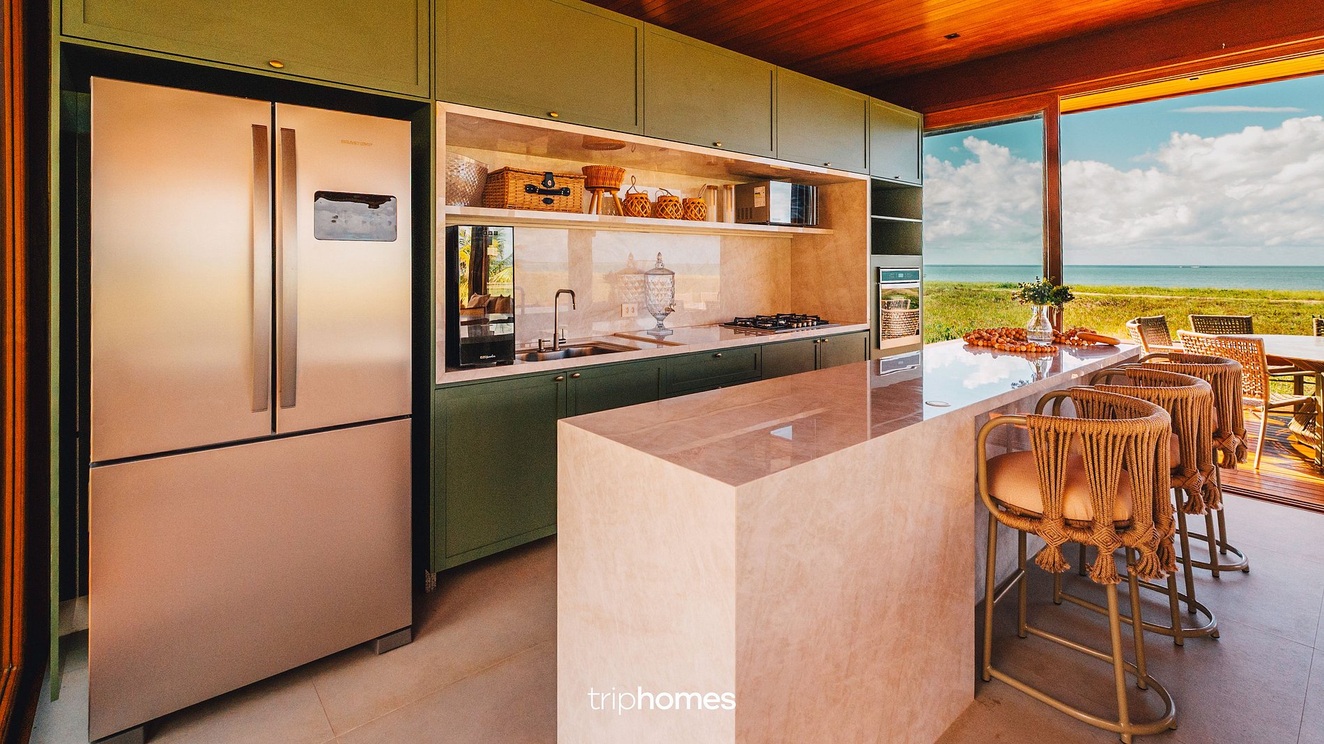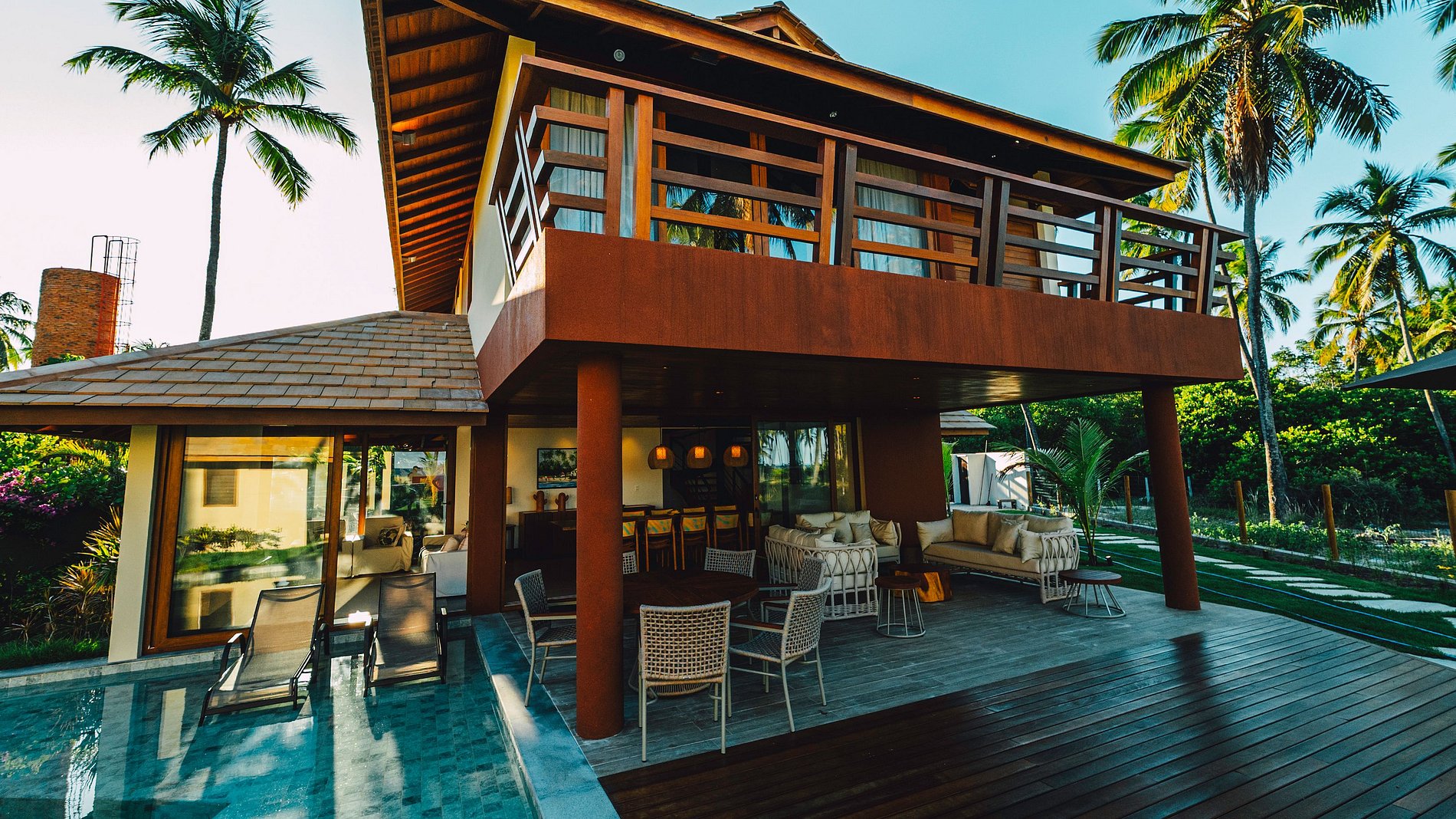 À frente das casas, o gazebo de frente para o mar é um espetáculo à parte. Com área coberta e descoberta, oferece uma cozinha de apoio equipada com ilha central, geladeira, cooktop, adega e forno, além de uma mesa oval para 10 pessoas e sofás em corda náutica que acolhem com charme e sofisticação. O deck de madeira, suspenso sobre a areia, permite que as refeições sejam feitas com o mar a poucos passos de distância — apenas 20 metros separam o gazebo da faixa de areia, tornando o cenário ainda mais exclusivo.