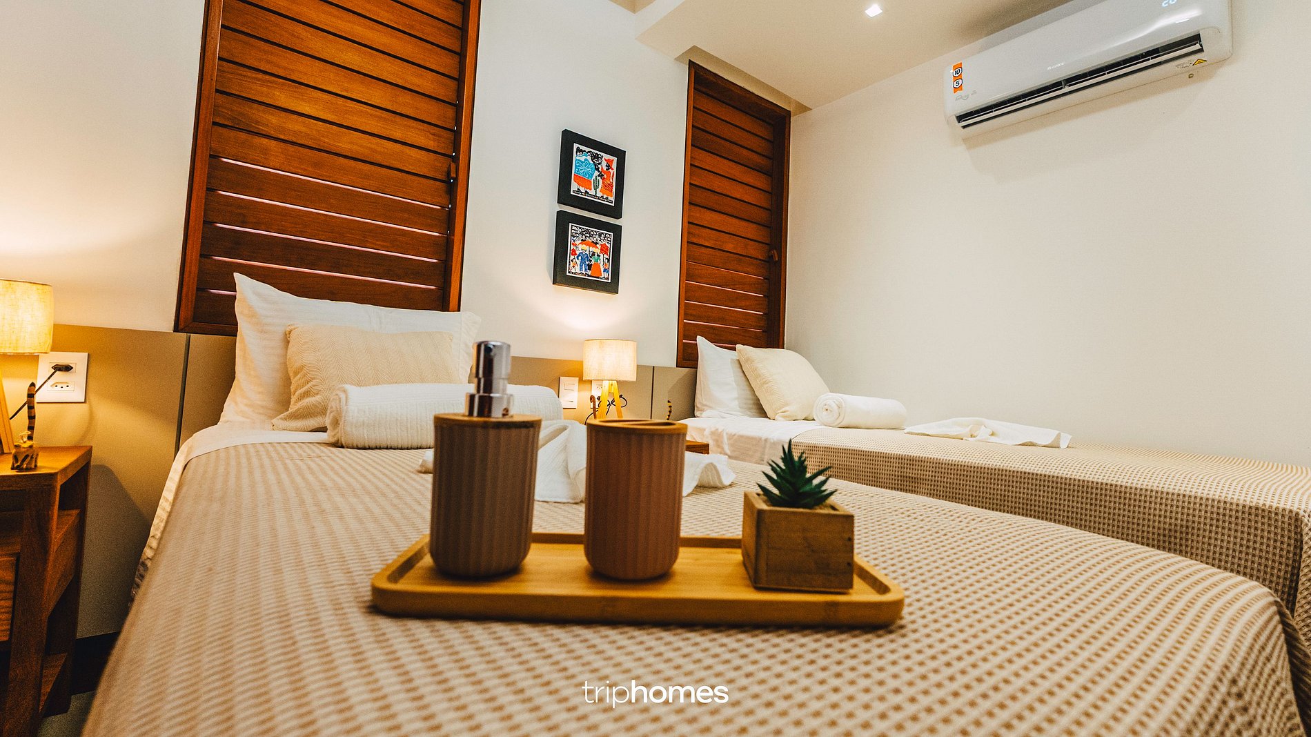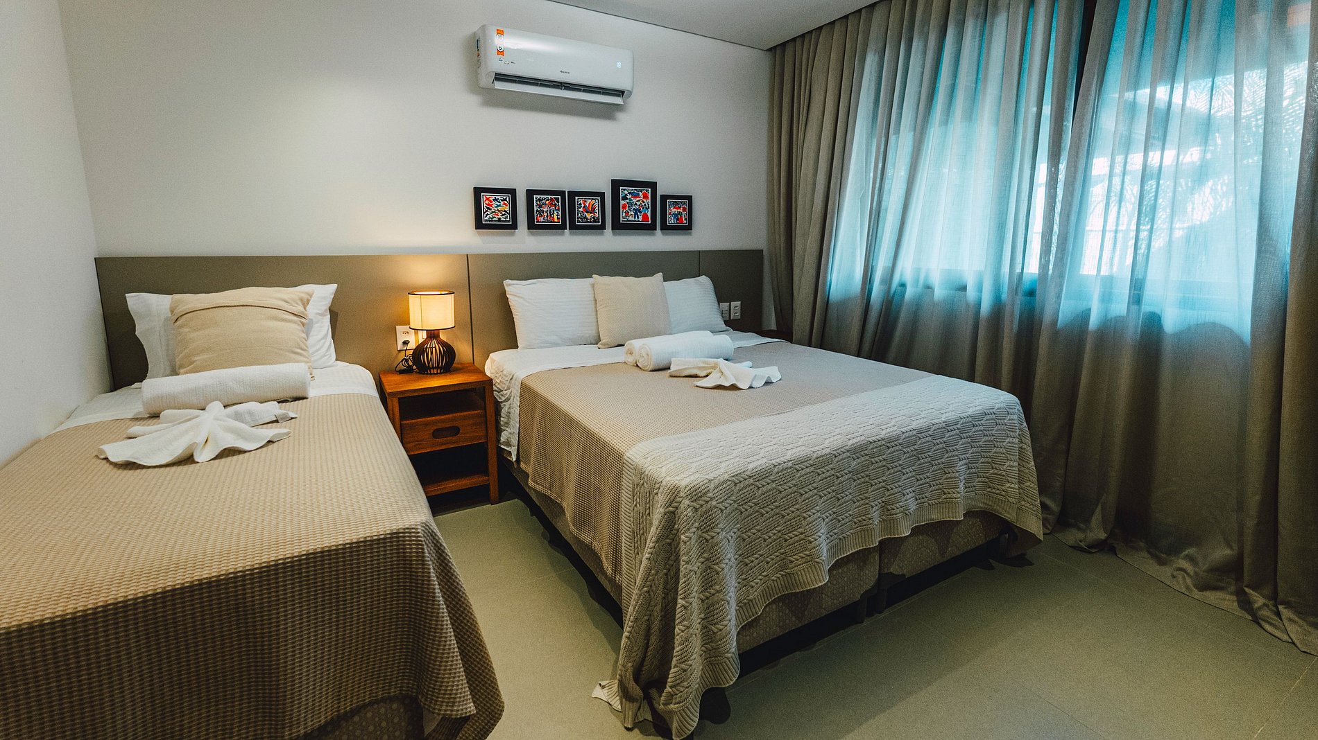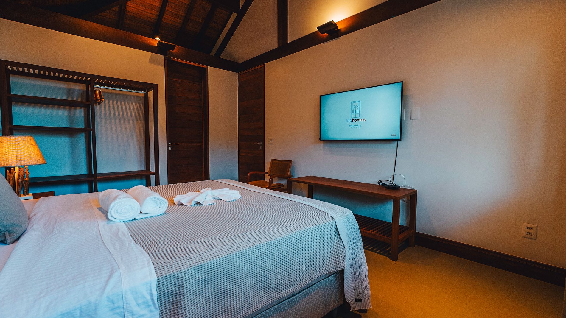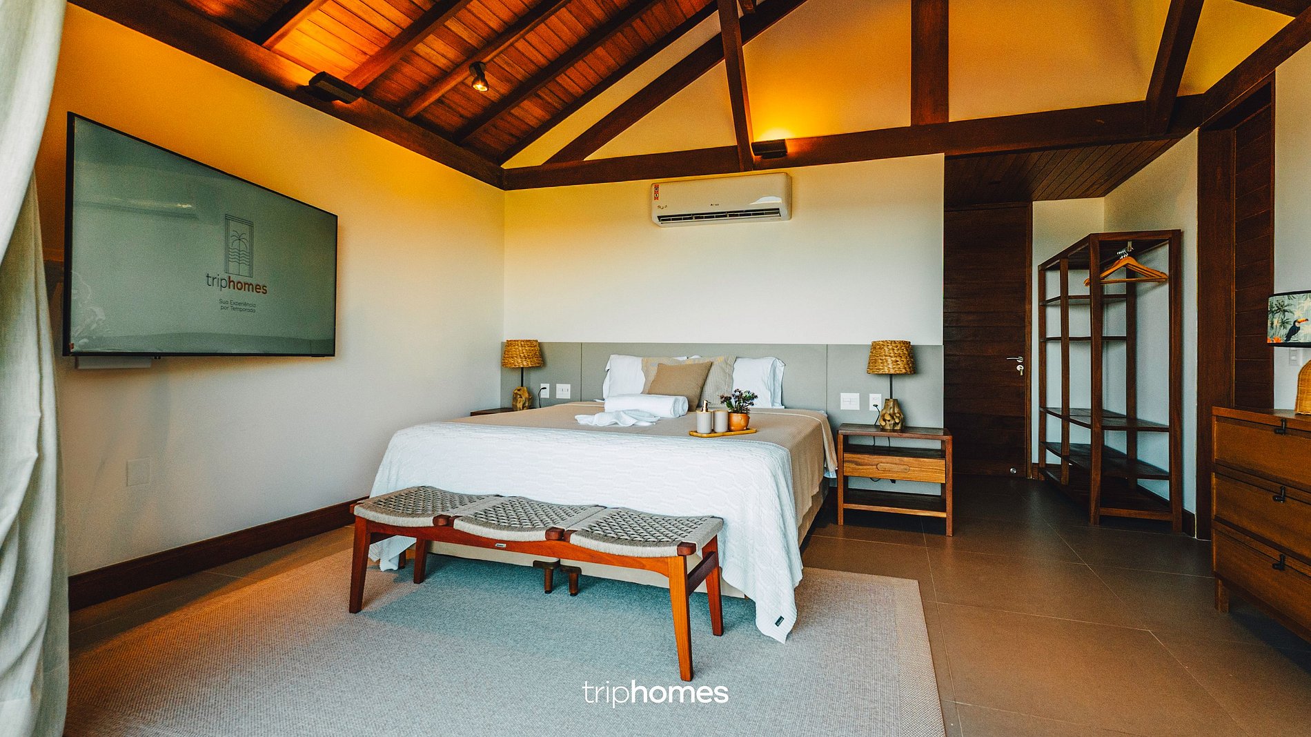 O layout das suítes foi pensado para acomodar com conforto e funcionalidade. No pavimento térreo, as suítes oferecem camas queen ou de solteiro, mobiliário funcional e ar-condicionado, ideais para quem prefere evitar escadas. Já no andar superior, as suítes master se destacam com camas king size, amplas varandas e vista panorâmica para o mar — exclusividade da Unidade 1. Algumas suítes também possuem TVs de até 70 polegadas, estantes abertas, poltronas e decoração natural, reforçando o conceito de uma hospedagem que valoriza o conforto sem excessos.