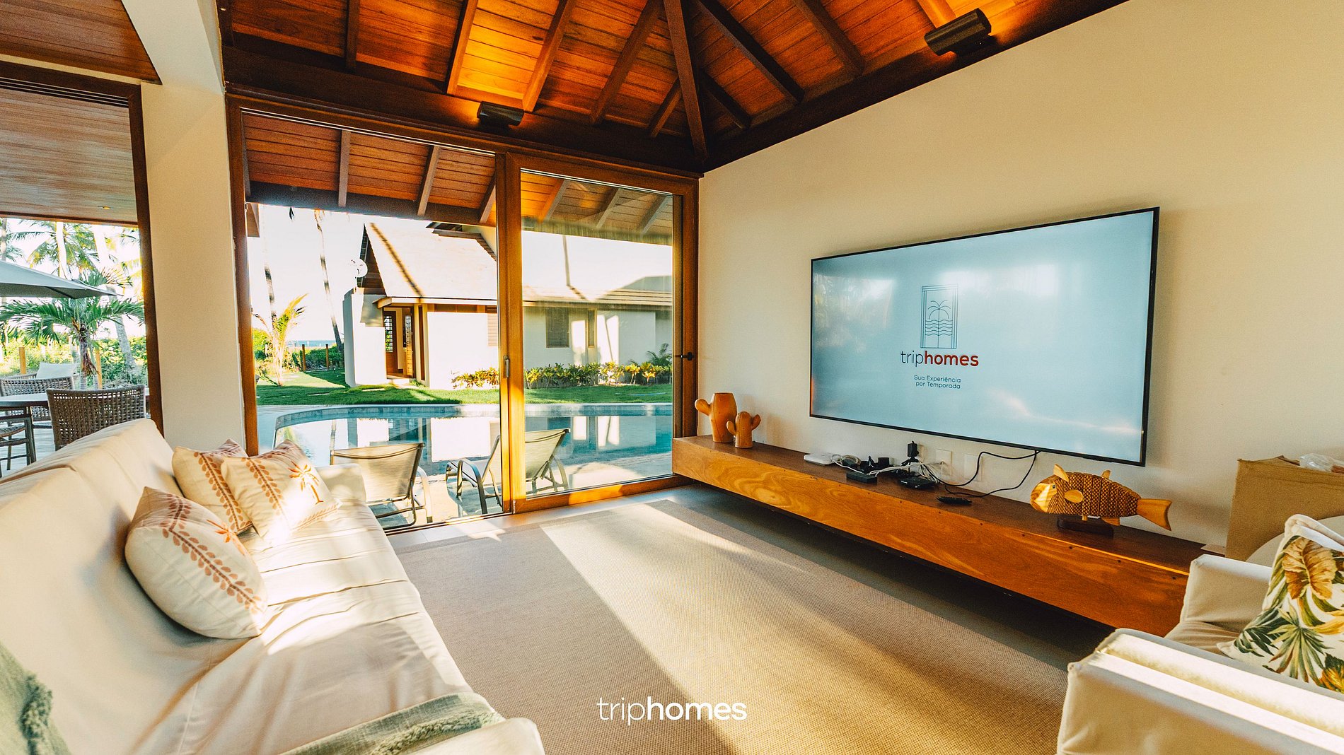 Cada casa do complexo oferece ambientes amplos e integrados, projetados para o bem-estar e a convivência. As áreas gourmet são convidativas, com mesas redondas cercadas por cadeiras de corda náutica e piscinas com formato orgânico que se conectam naturalmente à arquitetura do espaço. A ambientação externa é complementada por espreguiçadeiras, sofás e ombrelones que transformam cada área de lazer em um convite ao descanso. Internamente, as salas de estar contam com sofás generosos, poltronas confortáveis, decoração suave e televisões de última geração, criando um ambiente acolhedor para reunir todos em momentos de relaxamento. As salas de jantar, também amplas, se conectam às cozinhas completas, equipadas com eletrodomésticos modernos, como air fryer, freezer vertical, micro-ondas, bebedouro e fogão de cinco bocas.