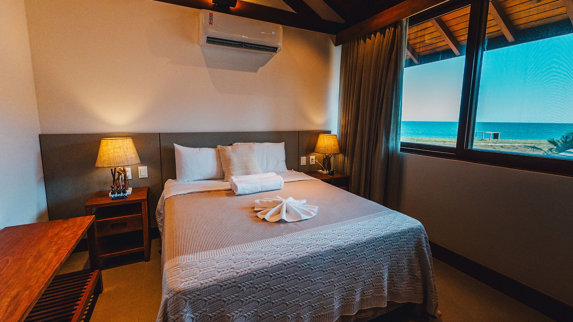 O layout das suítes foi pensado para acomodar com conforto e funcionalidade. No pavimento térreo, as suítes oferecem camas queen ou de solteiro, mobiliário funcional e ar-condicionado, ideais para quem prefere evitar escadas. Já no andar superior, as suítes master se destacam com camas king size, amplas varandas e vista panorâmica para o mar — exclusividade da Unidade 1. Algumas suítes também possuem TVs de até 70 polegadas, estantes abertas, poltronas e decoração natural, reforçando o conceito de uma hospedagem que valoriza o conforto sem excessos.