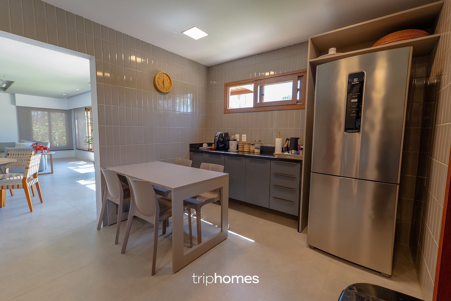 Ao lado, a cozinha principal é equipada com tudo o que você precisa para preparar refeições especiais: geladeira grande, fogão de cinco bocas, micro-ondas, air fryer, bebedouro, sanduicheira, torradeira e liquidificador, tudo disposto de forma prática e funcional. Complementando os espaços sociais, a ampla sala de jantar oferece uma mesa retangular para 12 pessoas, ideal para refeições em grupo, sempre com muito conforto.