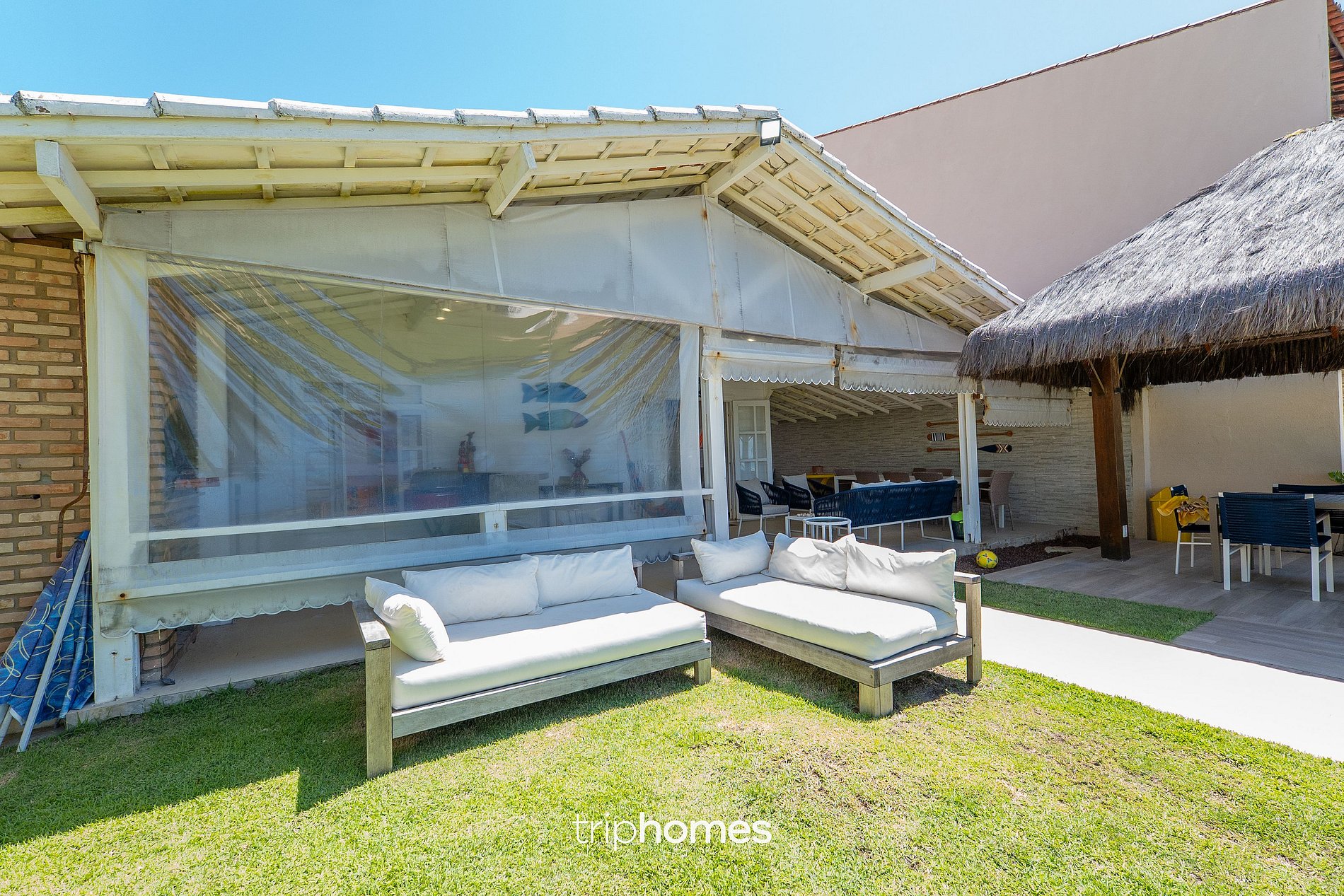 Na entrada, a propriedade conta com duas garagens — uma para até quatro carros e outra com capacidade para dois veículos — facilitando o acesso dos hóspedes e recebendo-os em um ambiente arborizado e acolhedor. Os jardins conectam harmoniosamente as duas residências, ambas com áreas de lazer completas, incluindo sofás, redes, chuveirões, espreguiçadeiras, mesas amplas e varandas equipadas para refeições ao ar livre e confraternizações.