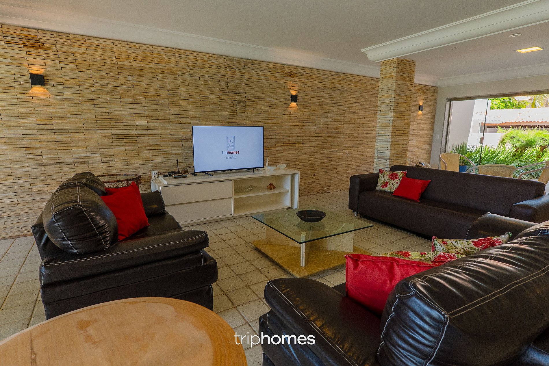A primeira casa, com vista privilegiada para o mar, é o coração da propriedade. Sua área externa abriga uma piscina moderna em formato de L com corrimão de acessibilidade, futmesa, redes de descanso e diversas mesas com cadeiras para até 20 pessoas distribuídas entre os ambientes. No interior, a sala de estar climatizada reúne três sofás, poltronas, TV de 40 polegadas, mesas de centro e jantar, além de um frigobar de vinho, cafeteira e objetos decorativos em estilo rústico. A cozinha, totalmente equipada, dispõe de dois refrigeradores, um freezer, fogão de 5 bocas, airfryer, liquidificador e sanduicheira.