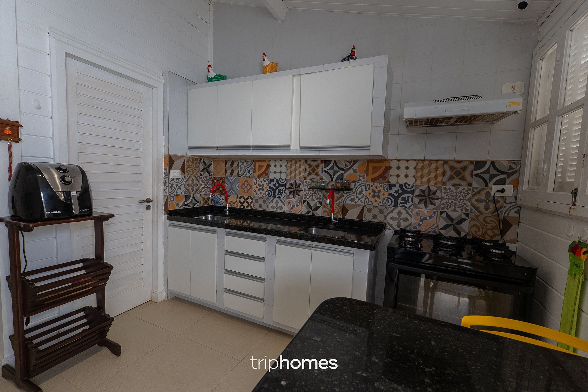 A segunda casa, igualmente aconchegante e integrada ao paisagismo, possui área gourmet com churrasqueira de alvenaria, churrasqueira a bafo americana, bancada de alvenaria com tampo de pedra, pia com cuba e conjunto de mesas e sofás para integração. Internamente, a sala de estar climatizada oferece TV de 50 polegadas, sofá, poltrona com apoio para os pés, cômodas em madeira, lustre de ferro e mesa de jantar redonda com 8 cadeiras. A cozinha conta com geladeira, freezer, fogão de 5 bocas, airfryer, micro-ondas, bebedouro com filtro e liquidificador.