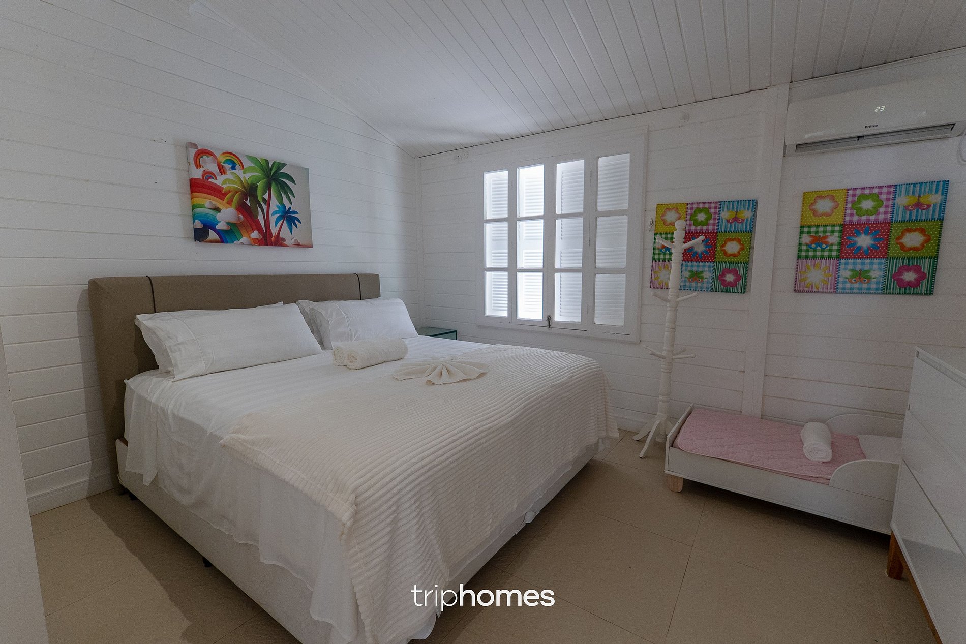Na área dos quartos da segunda casa, são quatro quartos, sendo duas suítes e dois quartos adicionais, todos climatizados. Um dos quartos conta com cama king, espelho vertical e armário com gavetas. A suíte principal possui frigobar, berço para bebê, cômoda, TV de 50" e decoração refinada. Os banheiros seguem o padrão de acabamento com box de vidro, cuba moderna, chuveiro com aquecedor e espelhos verticais. A lavanderia da unidade conta com duas máquinas de lavar, sendo uma lava e seca.