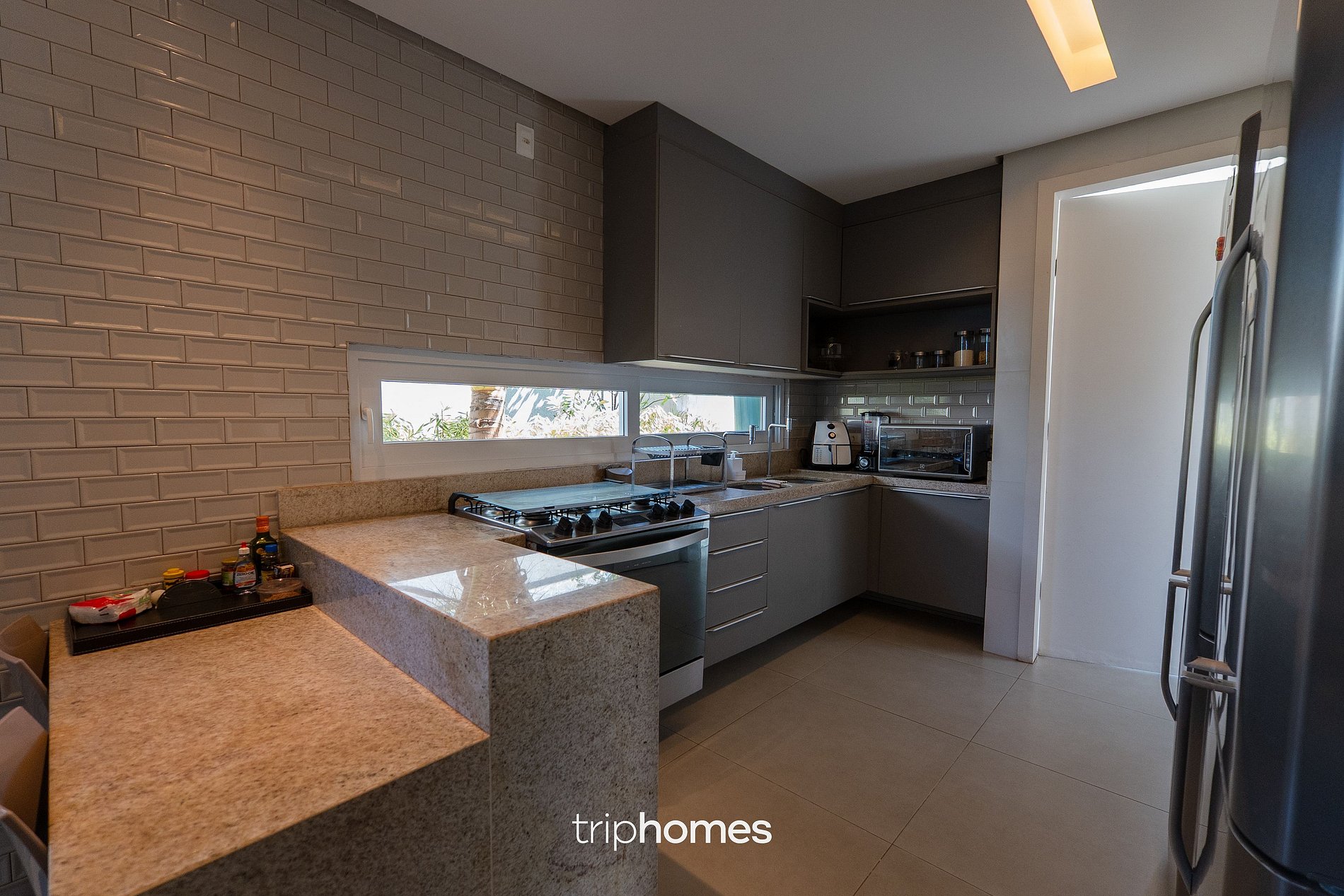 Internamente, o ambiente social é composto por uma sala de estar com sofá em L para até sete pessoas, TV de 70” e som JBL, integrando-se à sala de jantar com mesa para 14 lugares. A cozinha, totalmente equipada, oferece duas geladeiras, fogão com forno, micro-ondas, liquidificador, airfryer e bebedouro, além de uma área de serviço com freezer vertical e máquina de lavar.