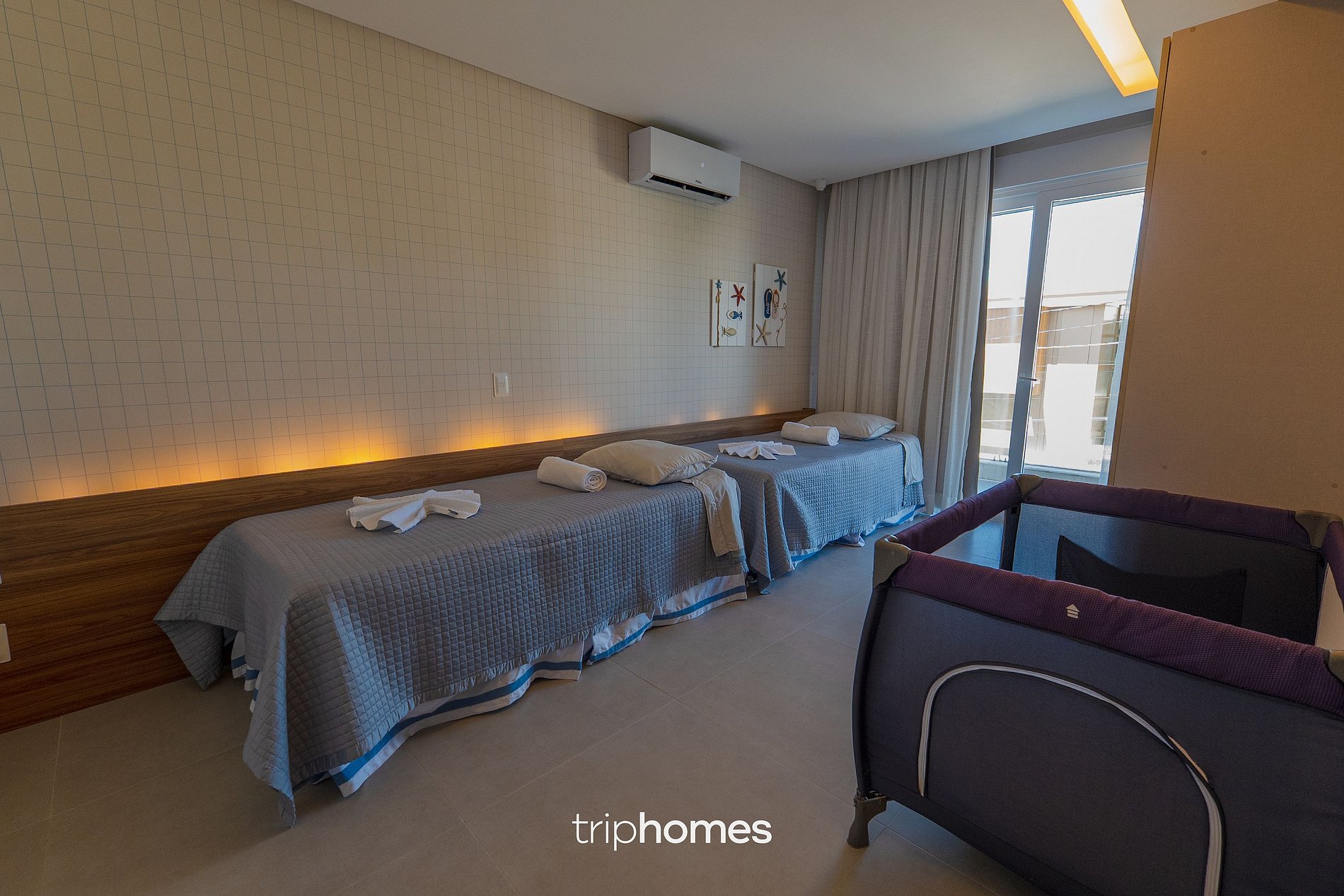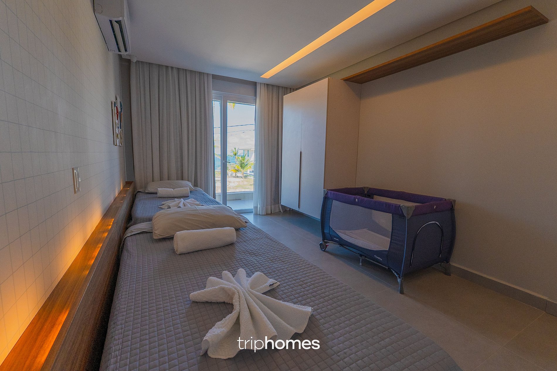 Na área íntima, a mansão acomoda confortavelmente grandes grupos em suas seis suítes climatizadas. A suíte térrea possui cama queen e estrutura funcional. No andar superior, cinco suítes adicionais garantem versatilidade e conforto, com camas queen, camas de solteiro com suportes auxiliares, berço e espaços que variam entre 4 a 6 hóspedes por quarto. A Suíte Master se destaca com cama king, mesa de trabalho, varanda privativa com vista para o mar e total exclusividade.