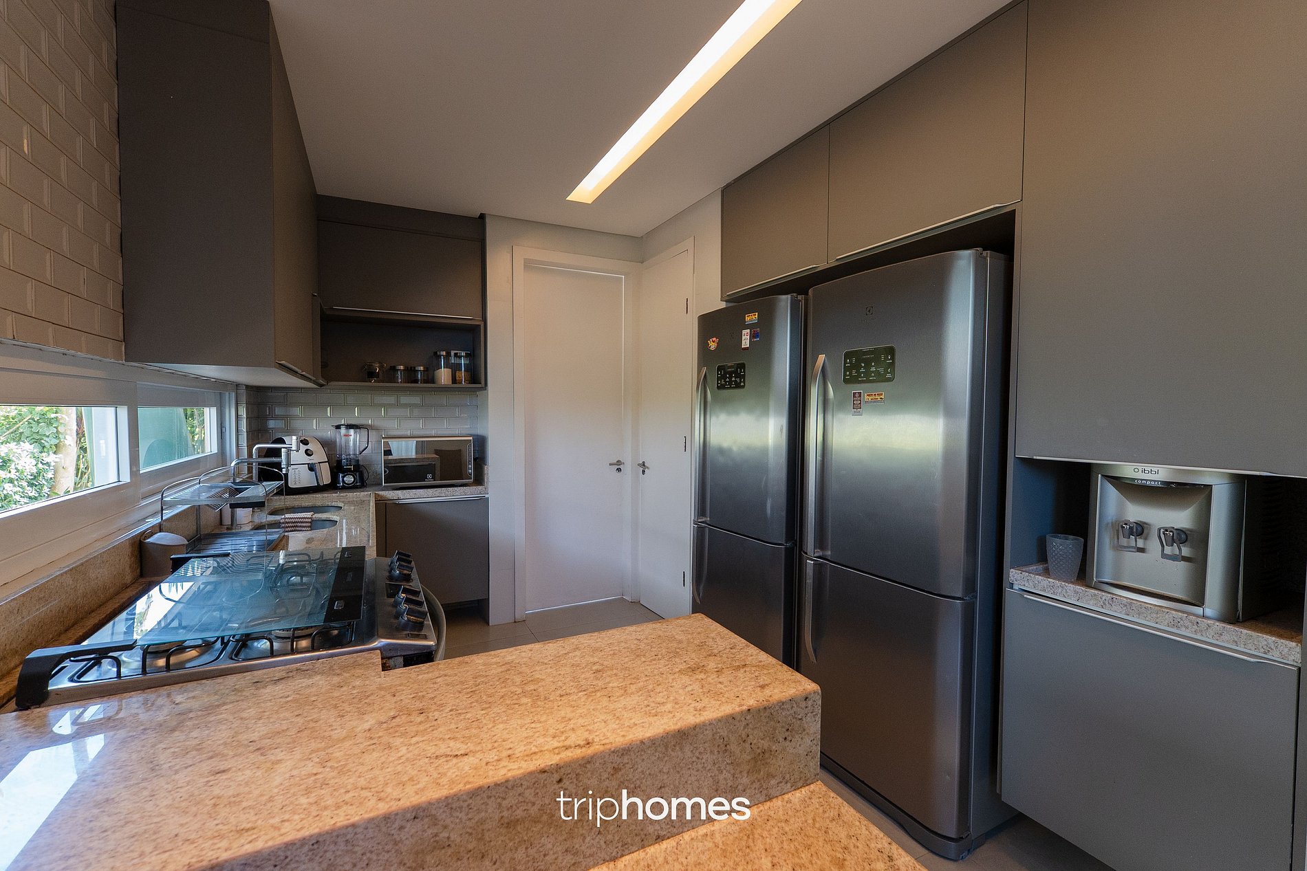 Internamente, o ambiente social é composto por uma sala de estar com sofá em L para até sete pessoas, TV de 70” e som JBL, integrando-se à sala de jantar com mesa para 14 lugares. A cozinha, totalmente equipada, oferece duas geladeiras, fogão com forno, micro-ondas, liquidificador, airfryer e bebedouro, além de uma área de serviço com freezer vertical e máquina de lavar.