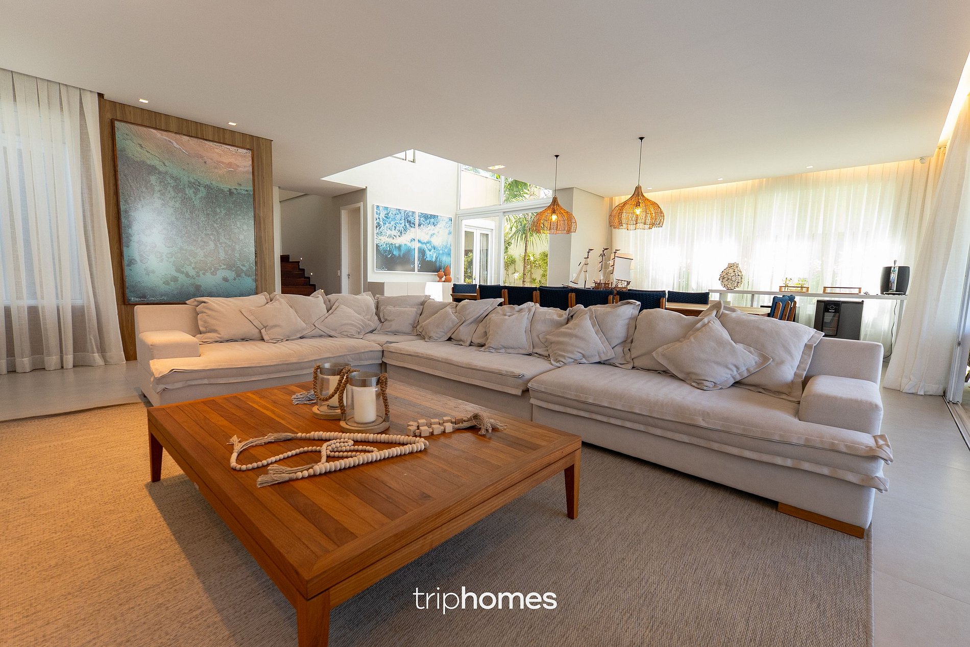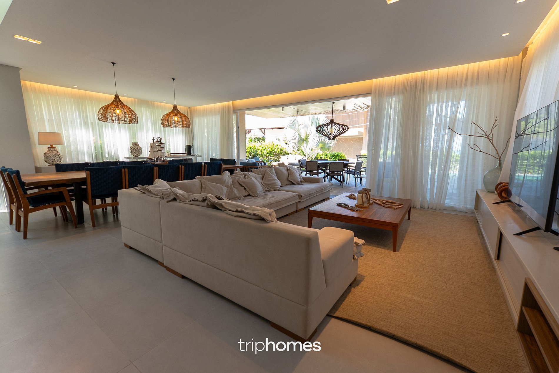 Internamente, o ambiente social é composto por uma sala de estar com sofá em L para até sete pessoas, TV de 70” e som JBL, integrando-se à sala de jantar com mesa para 14 lugares. A cozinha, totalmente equipada, oferece duas geladeiras, fogão com forno, micro-ondas, liquidificador, airfryer e bebedouro, além de uma área de serviço com freezer vertical e máquina de lavar.