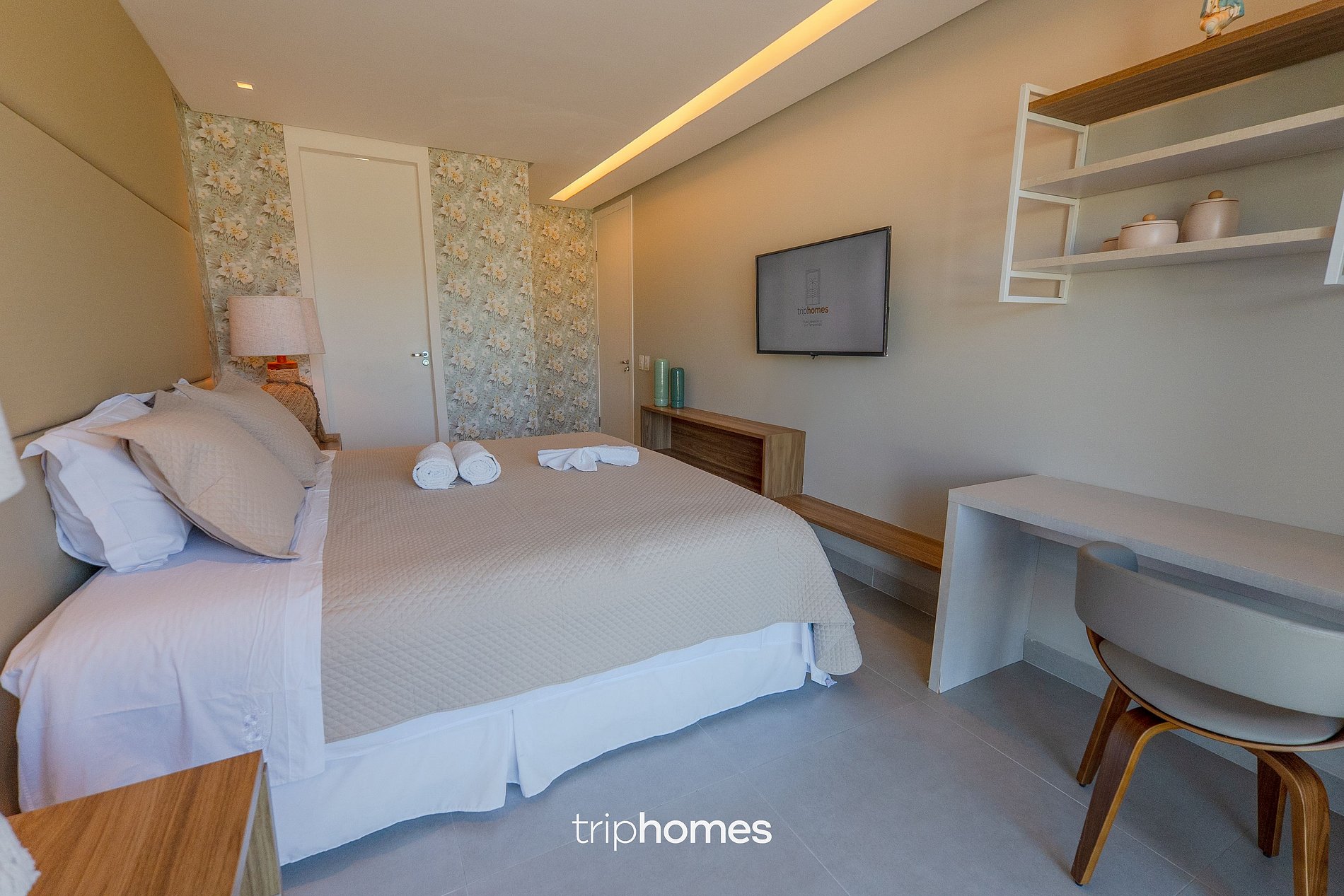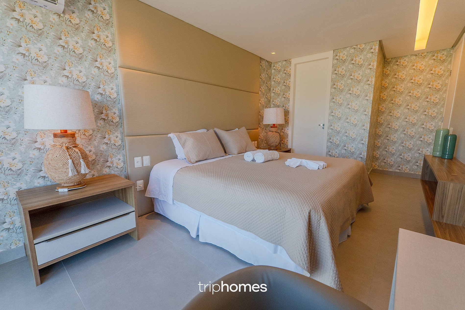 Na área íntima, a mansão acomoda confortavelmente grandes grupos em suas seis suítes climatizadas. A suíte térrea possui cama queen e estrutura funcional. No andar superior, cinco suítes adicionais garantem versatilidade e conforto, com camas queen, camas de solteiro com suportes auxiliares, berço e espaços que variam entre 4 a 6 hóspedes por quarto. A Suíte Master se destaca com cama king, mesa de trabalho, varanda privativa com vista para o mar e total exclusividade.