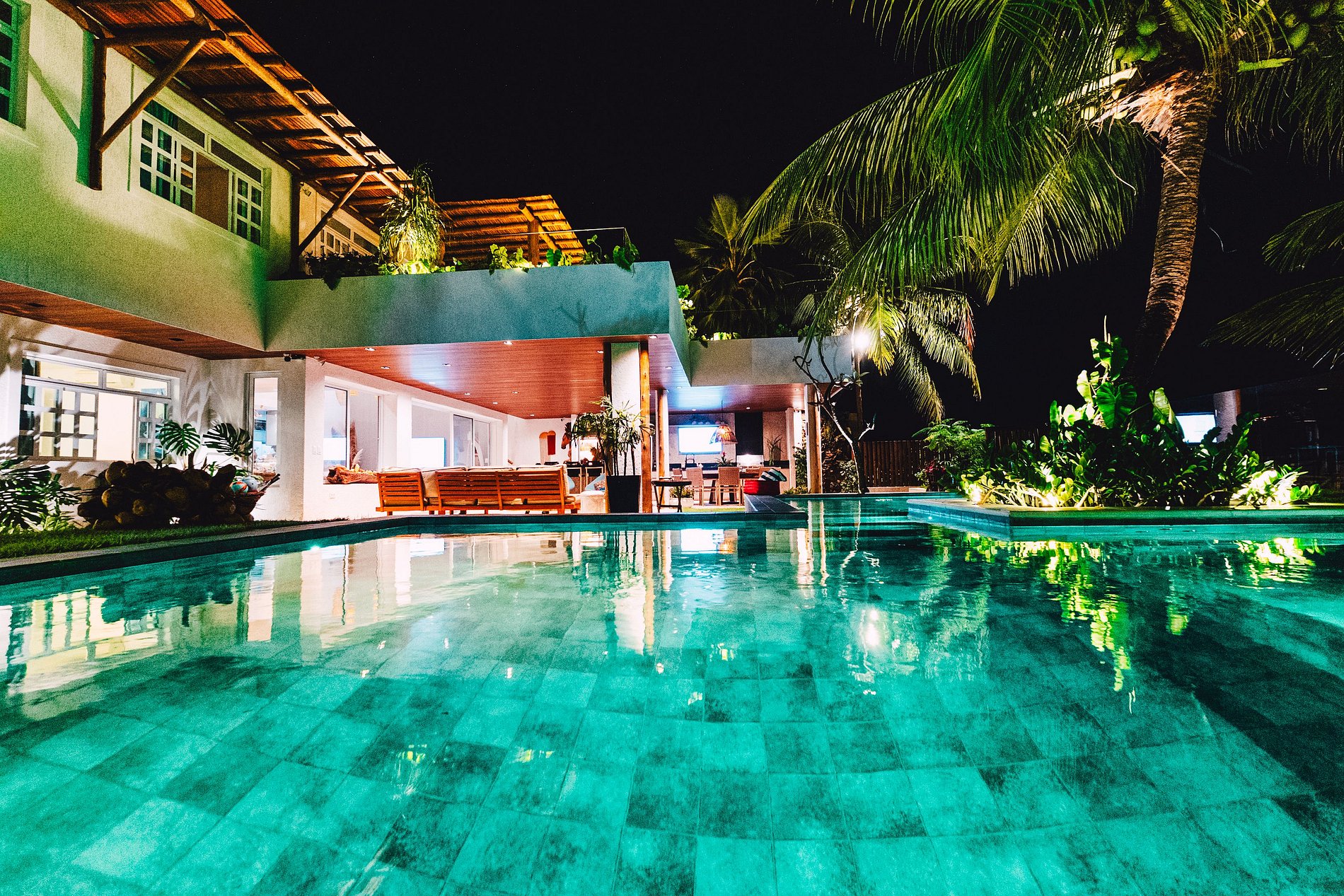 Piscina privativa com iluminação cênica e banheira de hidromassagem.