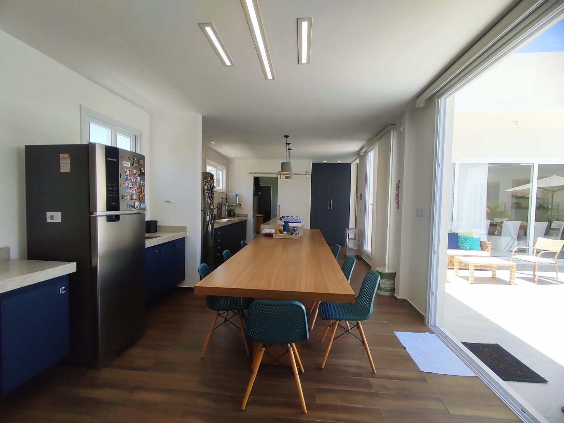 Cozinha completa com eletrodomésticos e utensílios para preparar refeições, mesas e cadeiras para toda a família.