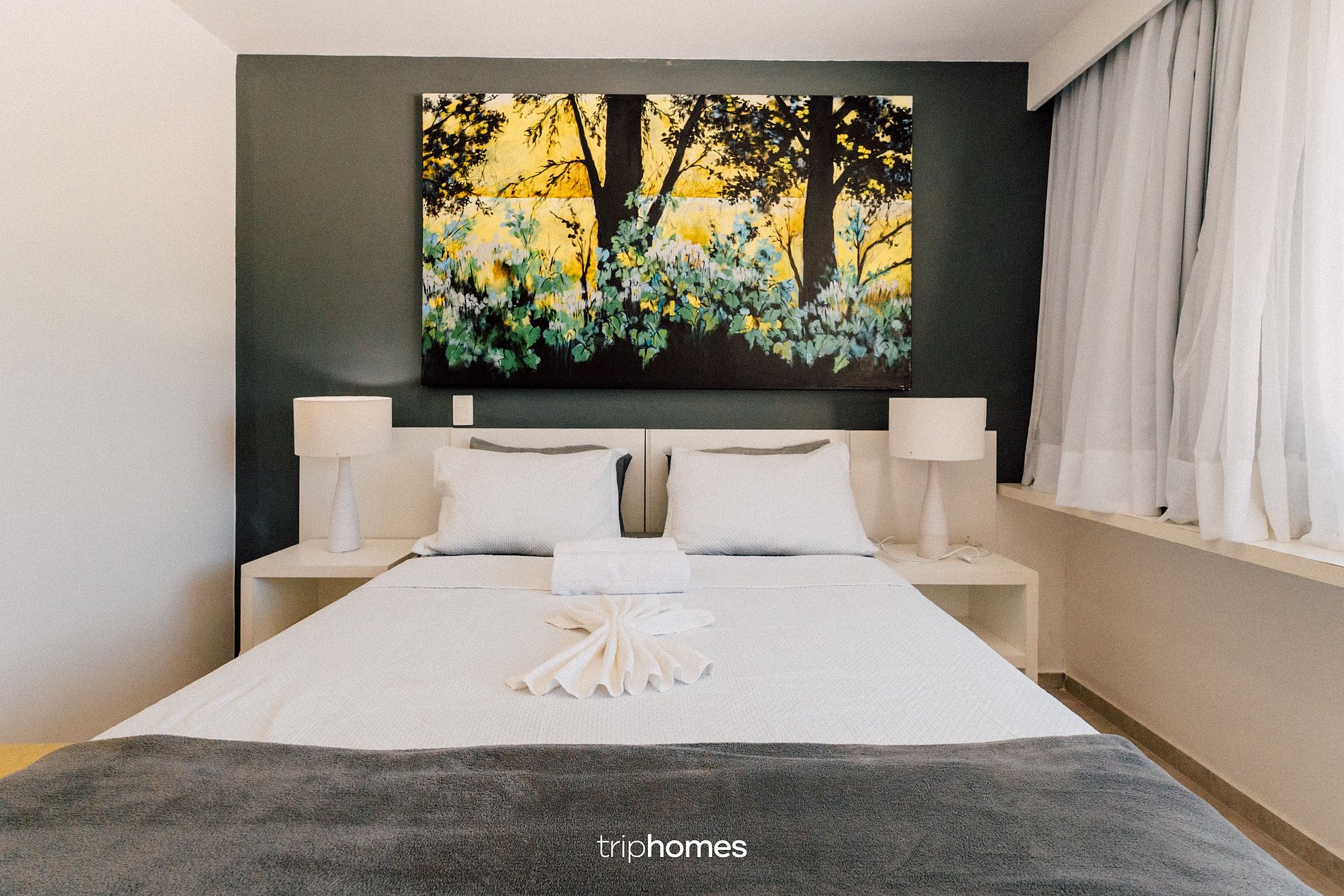 • Decoração: quadro em tons amarelos sobre a cabeceira, com tema náutico.