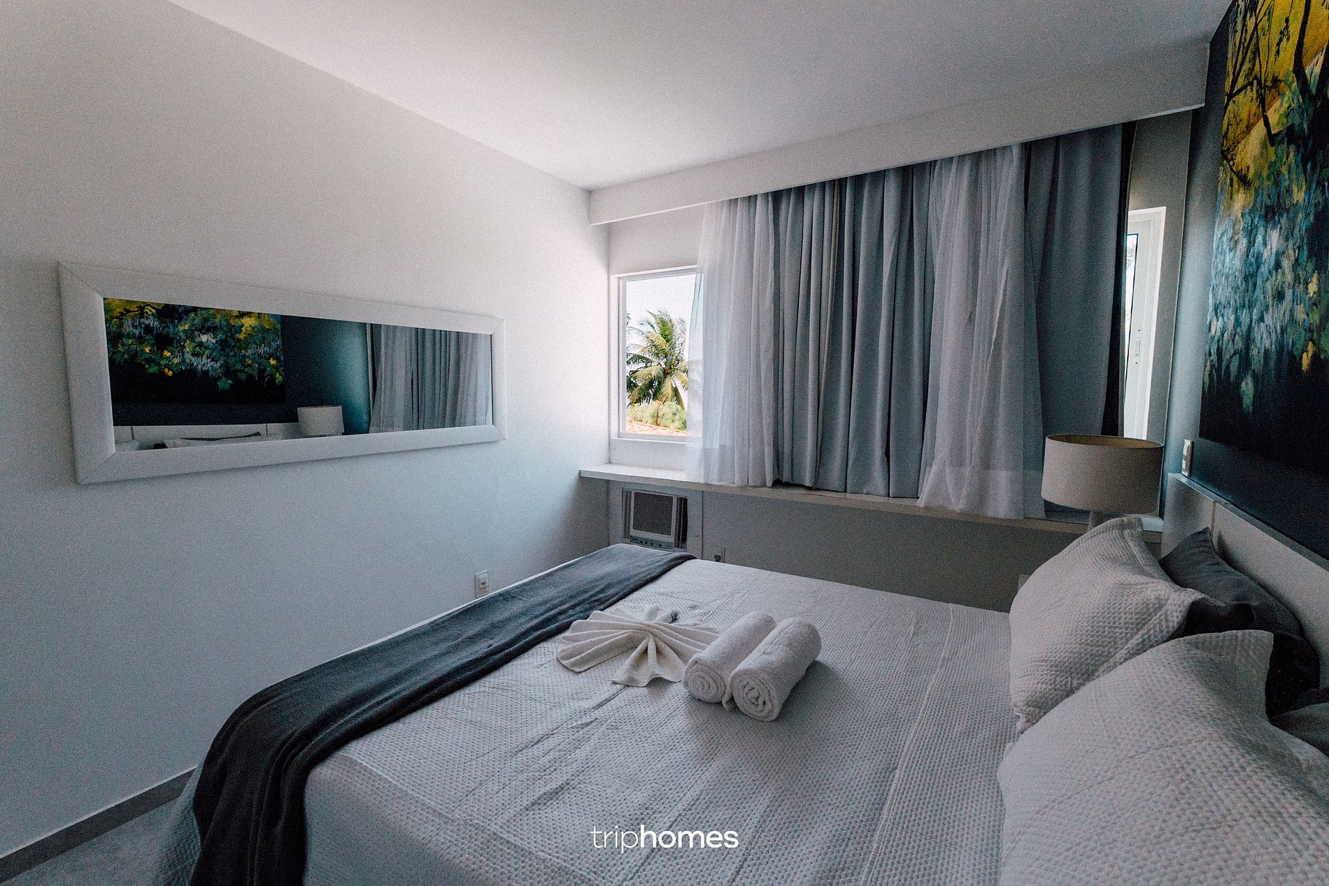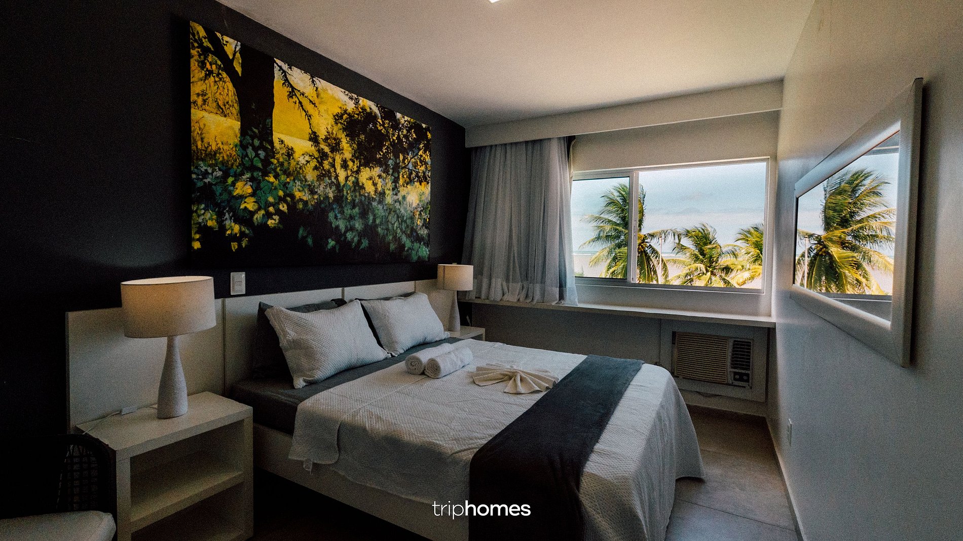 • Janela ampla com cortinas brancas, vista para o jardim/piscina e coqueiros da praia.