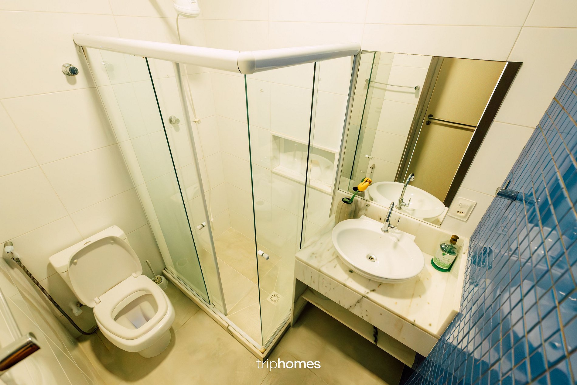 • Revestimento em madeira clara e pastilhas, trazendo aconchego.